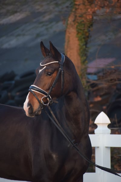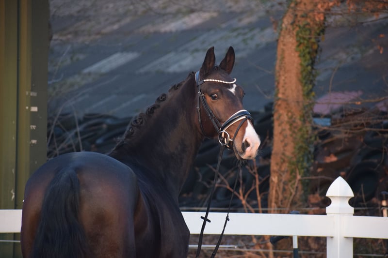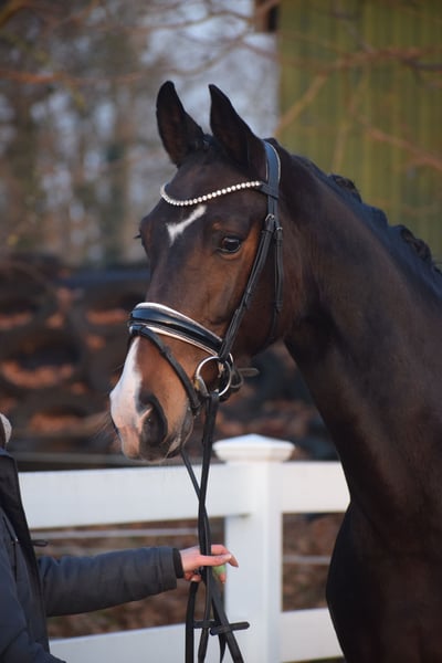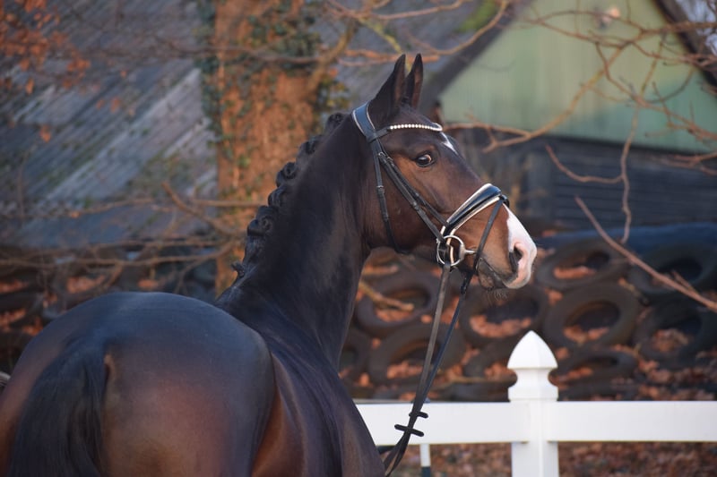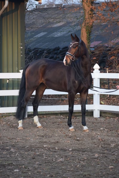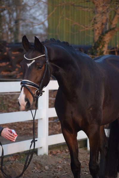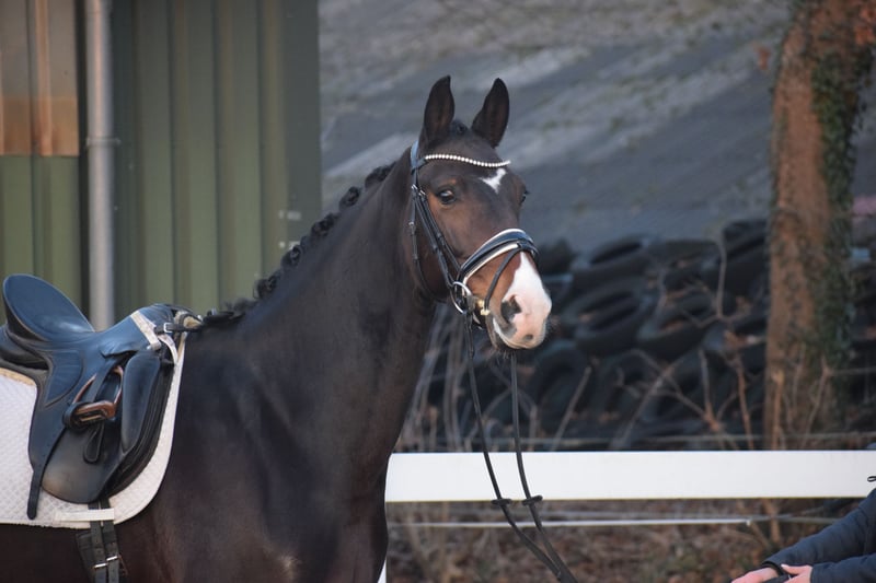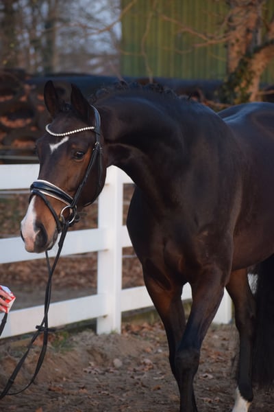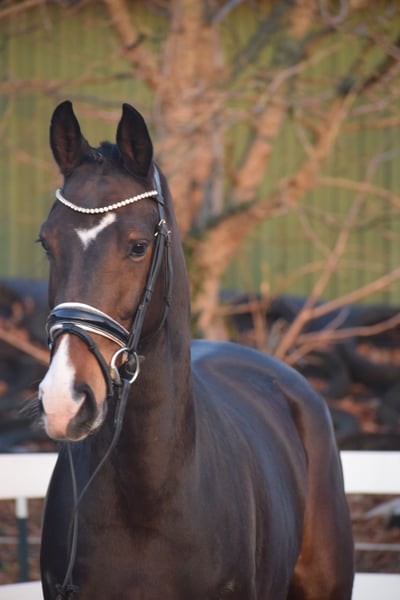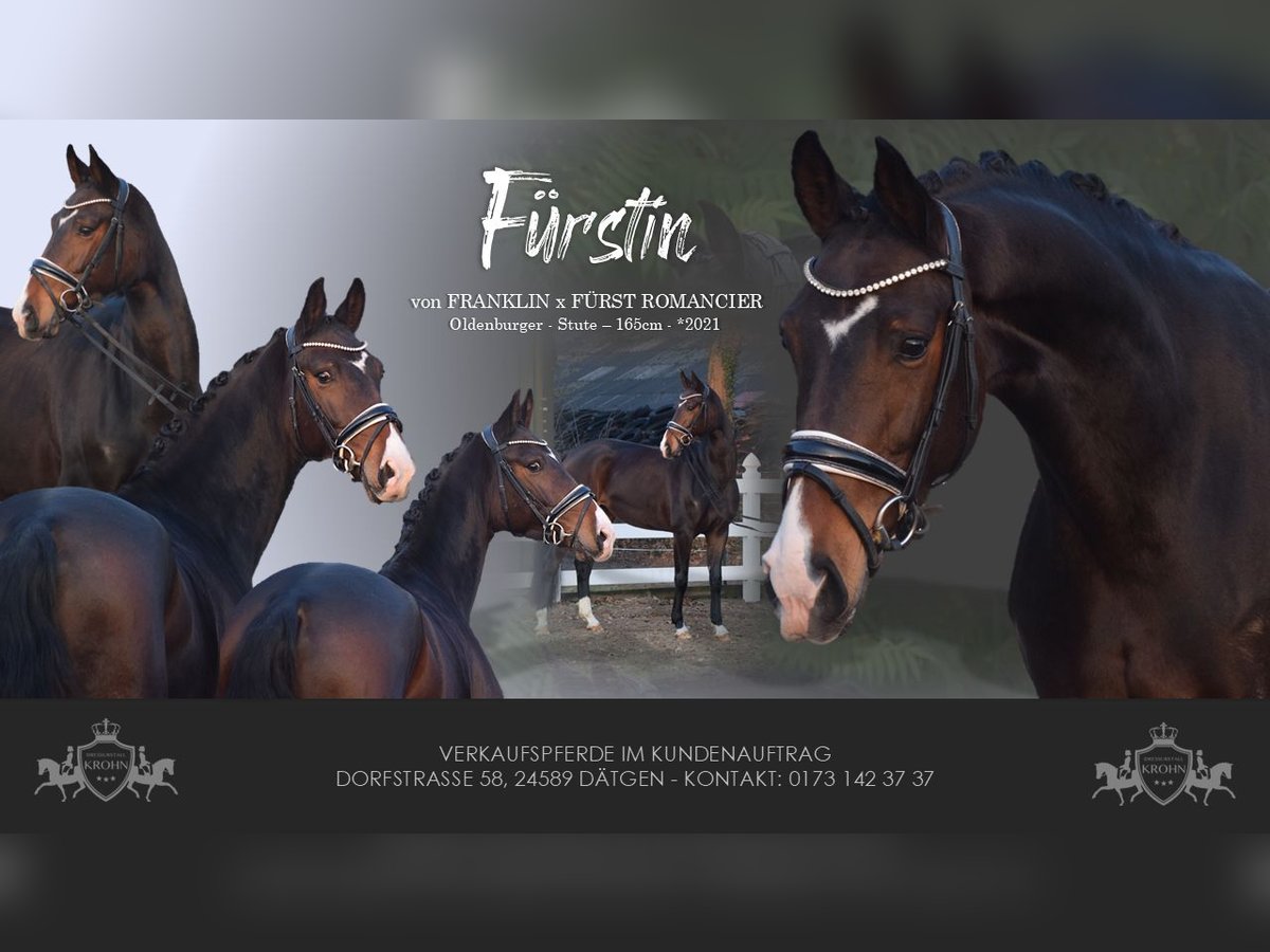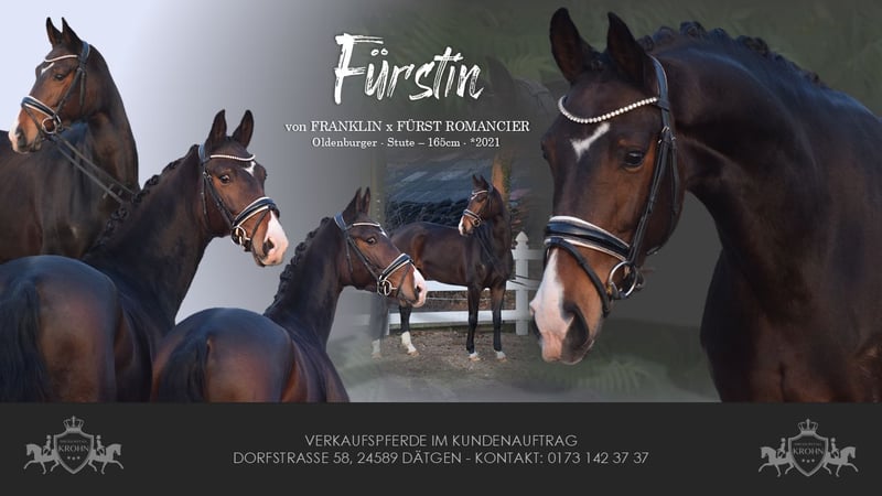WUNDERSCHÖNE, TYPSTARKE, ARBEITSWILLIGE & LIEBENSWERTE DRESSUR-NACHWUCHS STUTE - 4 x WEISS + STERN + SCHNIPPE - Bruder war Fohlenauktionsspitze (55.500€) - Junioren geeignet! Zum Verkauf steht in Vertretung des Besitzers diese wunderschöne, typstarke, liebenswerte 165cm große, 5 j., braune, Oldenburger Stute mit bester Dressurabstammung von FRANKLIN x FÜRST ROMANCIER und prominentem Bruder aus TOTAL HOPE der Fohlenauktionsspitze wurde (55.500€). "FÜRSTIN" hätte man schöner nicht zeichnen können. Mit dunkelbrauner Jacke, 4 weißen Socken, harmonischem Gebäude und typvollem Gesicht mit Stern und Schnippe ist sie schon Optisch edel. Unter dem Sattel zeigt sich die Stute unter verschiedenen Reitern ehrlich und unkompliziert mit eifrigem Arbeitswillen. Sie kennt bereits mehrere Hallen, Außenplatz und auch mal einen Sprung übers Kreuz. Sie ist altersgemäß, schonend, behutsam und professionell angeritten und befindet sich auf Dressurpferde A Niveau. FÜRSTIN" ist im Umgang ruhig und unkompliziert und ist dem Menschen sehr zugetan. In der Herde zeigt sie sich unkompliziert und sozial. In der Bewegung, zeigt sie sich engagiert, mit leicht herzustellender Anlehnung bei gut heran geschlossenem Hinterbein und Balance. Gerne kann "FÜRSTIN" nach dem Kauf bei uns im professionellen Beritt verbleiben. Ein guter und aktueller TÜV mit Röntgenbildern (Standard + Hals + Rücken) + klinischer Untersuchung liegt vor.