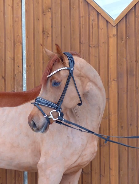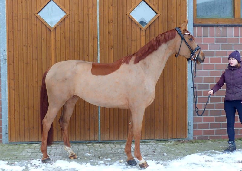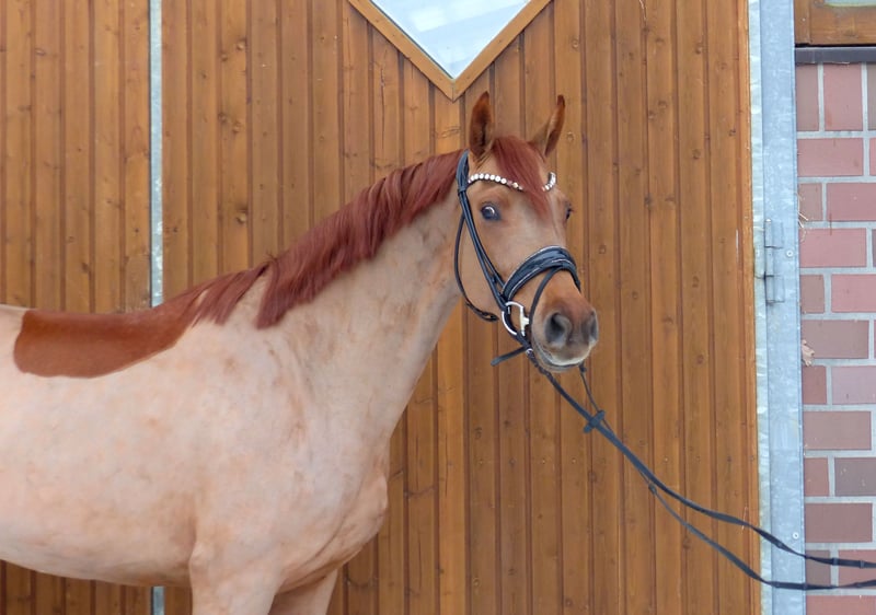 This beautiful mare impresses with her excellent conformation and very charming personality. She also has three very good basic gaits. Currently, she is at a good Dressage Pferde A level and is easy to ride. She is always motivated and enjoys working. A great horse for further training. She is very well-behaved and uncomplicated both in handling and under saddle. Just mount and have fun. X-rays are available. She has been regularly vaccinated, dewormed, and presented to the blacksmith.