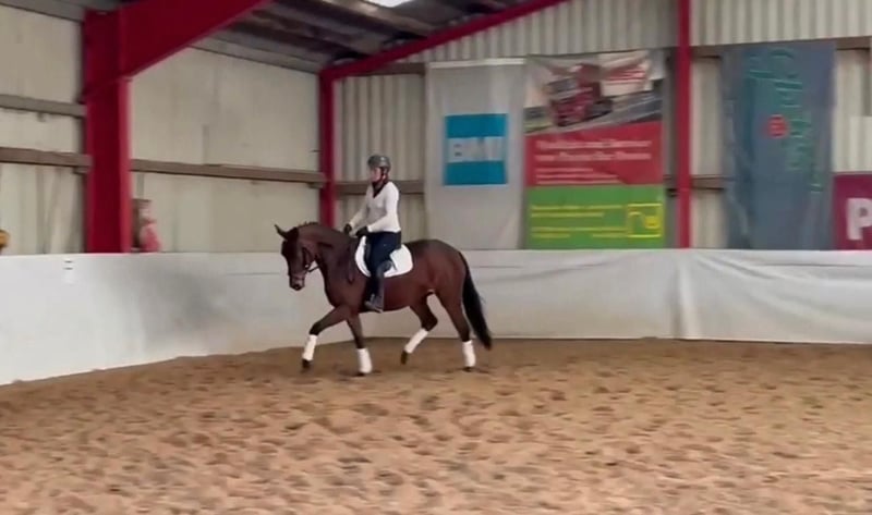 Carla, È una femmina compatta e bella, con tre ottimi giri fondamentali. È stata già montata, ma attualmente non viene più cavalcata poiché la proprietaria è in gravidanza. In maneggio è dolce, anche se un po' timorosa o riservata. Mostra anche talento nel salto e potrebbe essere utilizzata come cavallo da allrounder. Penso che sia un ottimo cavallo di talento per una giovane promessa, a un prezzo fantastico. È un cavallo che ama lavorare e, una volta motivata, può sostenere anche 4-6 sedute di lavoro a settimana. Mi immagino successivamente come un eccellente cavallo di livello A/L. Il suo controllo veterinario, inclusa la schiena, è stato ottimo. Dentista e osteopata sono stati fatti regolarmente. È abituata a ferrature e al carico sul trailer. Al momento, purtroppo, non può essere provata in sella, motivo per cui il prezzo è adeguato. Tuttavia, è in perfetta salute, quindi non ci sono problemi di salute.