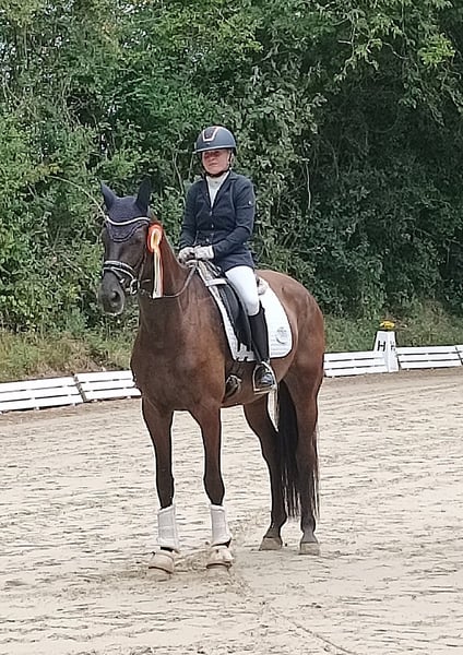 Diese charmante und leistungsbereite Stute überzeugt nicht nur durch ihr schickes Exterieur, sondern vor allem durch ihr Talent und ihre Ausstrahlung im Viereck. Bereits in Dressurpferde A vorgestellt und platziert, kann sie sich auf durchweg gute Benotungen in ihren bisherigen Prüfungen verweisen. Aktuell wird sie spielerisch an die Lektionen der Dressurpferde L herangeführt. Ihr schwungvoller, ausdrucksstarker Trab und ihre kraftvolle, bergauf gesprungene Galoppade sowie der taktreine Schritt, bietet alles, was man sich von einem Nachwuchspferd für den gehobenen Dressursport wünscht. Im Turniereinsatz zeigt sie sich absolut zuverlässig, ist brav, nervenstark und auch alleine im Viereck souverän unterwegs. Zudem ist die geländesicher, schmiede- und verladefromm. Auch Freizeitreiter werden mit ihr Freude haben: Sie zeigt sich stets zuverlässig, hat bereits positive Erfahrungen mit jüngeren Reiterinnen gesammelt und präsentiert sich immer brav und unkompliziert im Umgang. Diese 5-jährige Dressurstute bringt Talent, Lernbereitschaft und das gewisse Etwas mit, um in Zukunft im höheren Dressursport zu glänzen - gleichzeitig aber auch ein verlässlicher Partner für den Alltag zu sein. Ein kurzes Video vermittelt einen ersten Eindruck ihres Bewegungsablaufs und ihrer Qualität unter dem Sattel. Bei Interesse oder für weitere Informationen stehe ich gerne zur Verfügung. Ein Proberitt ist nach Absprache möglich. Kontaktieren Sie mich gerne, um mehr über dieses vielversprechende Pferd zu erfahren!