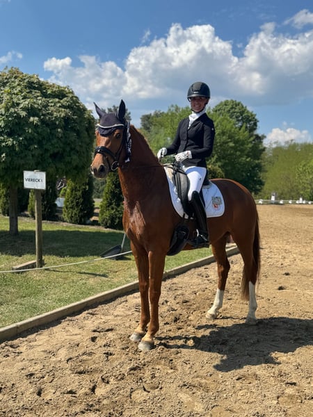 Cheval de dressage élégant et de qualité dans un cadre plus petit. Jument Oldenbourg par Desperados x Sir Donnerhall. Jeune cheval de 4 ans. Elle est fine et agréable à l'attelage et confortable à l'assiette. Expérience de jeune cheval souhaitable en raison de son âge. Un super cheval d'avenir avec des perspectives prometteuses . Il est également très brave et facile à manipuler. Radiographies disponibles. - directement de l'éleveur - né en 2020 - env.163cm Si vous êtes intéressé, n'hésitez pas à nous contacter par téléphone 017622388605.