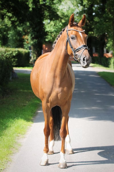 Beautiful Oldenburg Mare for Sale For sale is a pregnant Oldenburg mare, born in 2020. She presents herself in an elegant dark chestnut coat and has a height of 165 cm. This mare comes from a top-quality breeding and combines excellent bloodlines. Pregnant by By Your Side for 5/26. Her friendly and open nature makes her an ideal partner for all levels of experience. She is well-socialized and has a balanced character. Due to a pasture accident, she is not rideable. Genetically in top health. If you are interested or have further questions, please feel free to contact me. Visit us and see for yourself this wonderful mare!