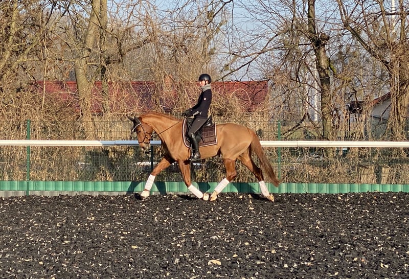 Stella La Diva (klacz, rudy, 1,72 m wzrostu, urodzona w 05.2020, Sir Donnerhall x Londonderry) to obiecujący koń do nauki jazdy w ujeżdżeniu. Obecnie jest na początku swojej kariery, pewnie porusza się we wszystkich trzech podstawowych chodach, rozpoczęła już naukę L-ćwiczeń. Na lonży i w terenie zachowuje się ciekawie i chętnie podąża naprzód, nawet na nieznanych ścieżkach. Wstępnie została rozpoczęta w wieku 4,5 lat, ale ze względu na kontuzję jej jeźdźca, a brak pośpiechu, wróciła na pastwisko, co pozwoliło jej na naturalny wzrost. Pod koniec lata 2025 ponownie rozpoczęła treningi i obecnie jest końcem uczącym się. Charakteryzuje się doskonałym chodem, szczególnie wysokim, z dużą mechaniką i siłą, równym i bardzo wygodnym galopem oraz lekkością ruchu. Stella jest bardzo lekka w ręku, zapewnia świetne odczucia podczas jazdy, wykazuje wysoką chęć do pracy i inteligencję. Jest bardzo uważna i przypomina młodego konia, który jeszcze nie potrafi w pełni ocenić wszystkich sytuacji. W kontaktach z ludźmi jest absolutnie spokojna, przyjazna, cieszy się z każdego głaskania i lubi być czyszczona. Dla niej szukamy jeźdźca lub jeźdźczyni, który poświęci czas, cierpliwość i miłość na jej szkolenie. Doświadczenie w pracy z młodymi końmi lub poziom A jest wskazane, ponieważ ze względu na wiek nie jest to koń dla początkujących. U nas jeździ ją matka i córka (16 lat). W celu gimnastyki zaczęliśmy pracę na tyczkach, co koń chętnie wykonuje i zaczyna nabierać rutyny. Poszukują tego ambitni amatorzy lub trenerzy, którzy chcą młodego konia z potencjałem. Jej pochodzenie jest nie do podważenia i kontynuuje wspaniałe cechy rodziny Donnerhall. Stomatolog 12/25 Zdjęcia rentgenowskie z kręgosłupem, bez zmian, z września 2025 roku