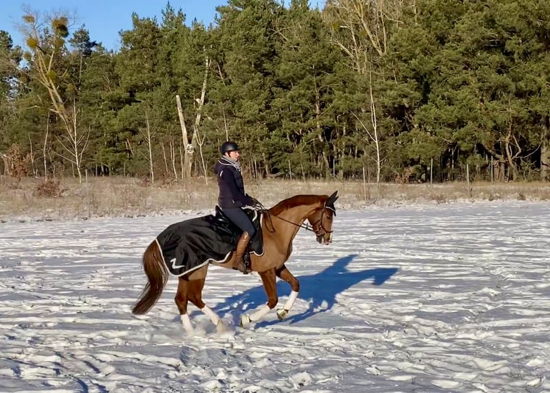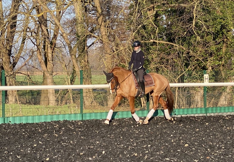 Stella La Diva (Stute, Fuchs, 1,72m Stockmass, *05.2020, Sir Donnerhall x Londonderry) ist ein vielversprechendes Ausbildungspferd für das Dressurviereck. Sie steht aktuell am Anfang ihrer Laufbahn, geht sicher in allen 3 Grundgangarten, L-Lektionen begonnen. Im Gelände überzeugt sie mit Neugier und geht auch bei unbekannten Wegen immer voran. Sie wurde zunächst 4,5 jährige angeritten und aufgrund der Verletzung ihrer Reiterin, da kein Zeitdruck bestand, wieder auf die Weide geschickt, was ihr Zeit zum wachsen gab. Im Spätsommer 25 erneut angefangen zu arbeiten und entspricht jetzt einem lernenden Pferd. Sie zeichnet sich durch einen hervorragender Trab mit viel Mechanik und Schub, gleichmäßige und sehr sitzbequeme Galoppade und einem leichtfüßig Gang aus. Stella ist sehr leichtrittig gibt dem Reiter ein tolles Reitgefühl mit hoher Arbeitsbereitschaft und Intelligenz. Sie ist sehr aufmerksam und entspricht einem jungen Pferd, welches noch nicht alle Situationen einschätzen kann. Im Umgang ist sie absolut unstutig, menschenbezogen, freut sich über jede Streicheleinheit und genießt es geputzt zu werden. Wir wünschen uns für sie eine Reiterin oder Reiter der sich die Zeit, Geduld und Liebe für ihre Ausbildung nimmt. Jungpferdeerfahrung oder gutes A-Niveau sind gewünscht, sie ist aufgrund ihres Alters kein Anfängerpferd. Bei uns wird sie von Mutter u Tochter (16) geritten. Zur Gymnastizierung haben wir mit Stangenarbeit begonnen, dort ist sie engagiert und beginnt Routine zu bekommen. Somit werden ambitionierte Amateure oder Ausbilder fündig die ein junges Pferd mit Perspektive suchen. Ihre Abstammungen kann sie nicht leugnen und führt die großartigen Eigenschaften der Donnerhall-Familie fort. Zahnarzt 12/25 Röntgenbilder mit Rücken, ohne Befund 09/25