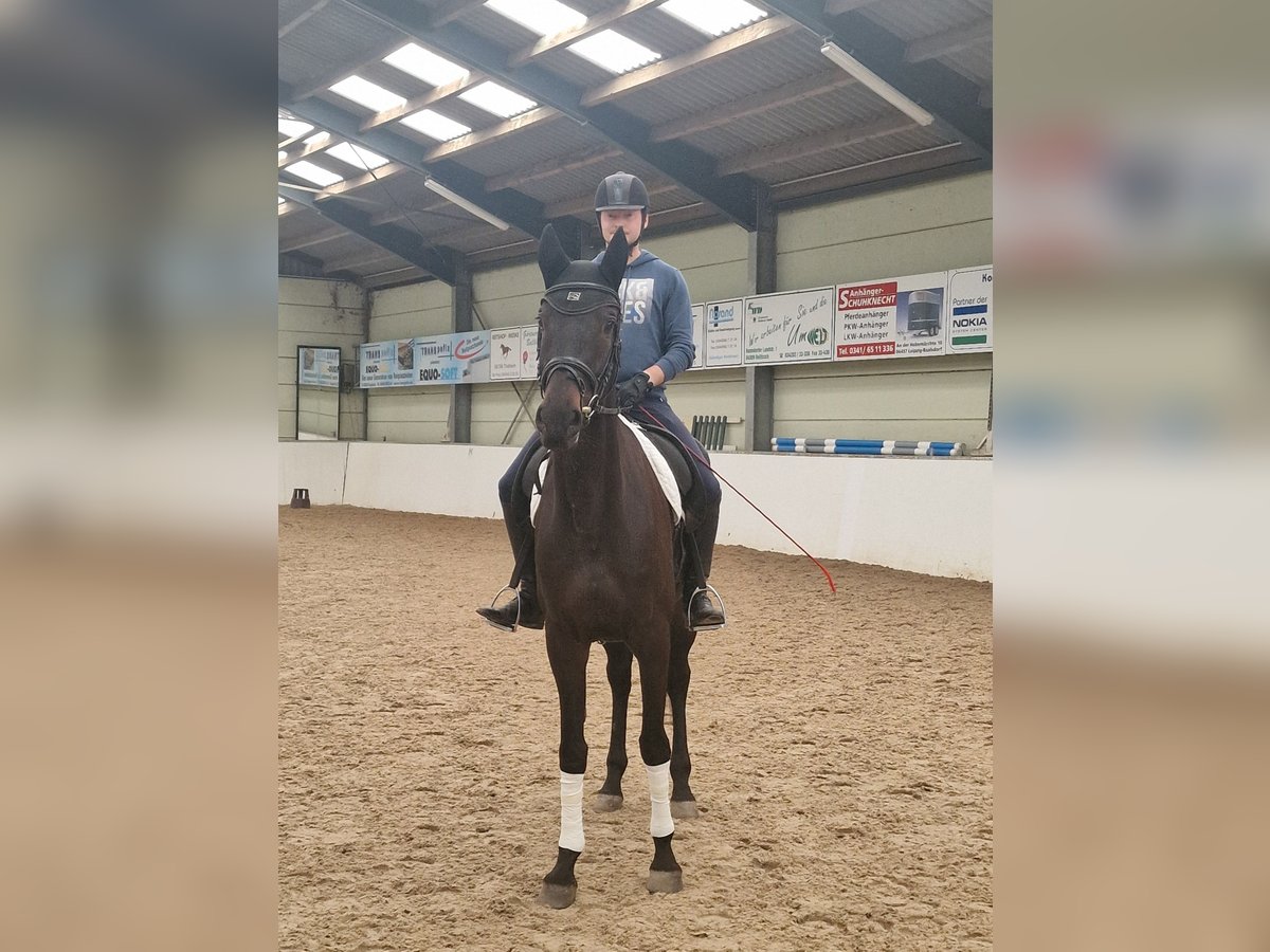 Wegen Aufgabe der Pferdehaltung! Zum Verkauf steht eine schwarzbraune Oldenburger Stute mit einem Stockmaß von 1,80m. Sie hat ein elegantes Erscheinungsbild und sehr gutes Potenzial für den Dressursport. Vom Beginn an zeigte sie großes Talent in ihrer reiterlichen Ausbildung. Ihre große Lernbereitschaft und ihre dabei eingesetzte Intelligenz untermalen ihre reiterliche Weiterentwicklung. Schnell lernt sie neue Lektionen und vertieft diese zum stetigen Abruf. Durch ihre Sensibilität ist sie nicht für Reitanfänger geeignet. Reiterlich präsentiert sich mit Maggi als sehr feinfühlige und sensible Stute mit hoher Lernbereitschaft und stets positiver Arbeitseinstellung. Sie ist fein an den Hilfen, gut durchlässig und angenehm weich in der Anlehnung. Unter dem Reiter zeigt sie sich motiviert und arbeitswillig, möchte gefallen und arbeitet konzentriert mit. Altersbedingt ist sie gelegentlich etwas schreckhaft, bleibt dabei jedoch stets ehrlich und geht mit Unterstützung des Reiters immer weiter. Unarten wie Buckeln oder Steigen sind nicht vorhanden. Geritten auf solidem A-Niveau, mit beginnender Ausbildung in Versammlung und Seitengängen. Aufgrund ihres langsamen Wachstums wurde sie erst vierjährig angeritten und dann entsprechend ihrer Wachstumsphasen langsam und sanft ausgebildet. Zur Zeit wird sie zweimal je Woche geritten und einmal longiert. Das Anlernen in der Führanlage hat sie hervorragend gemeistert, so dass sie zweimal in der Woche ins Karussell geht. Den Rest darf sie ganztägig mit einem weiteren Pferd auf der Koppel/Paddock verbringen. Zur Zeit hat sie noch keine Eisen. Im Umgang zeigt sie sich unkompliziert und sehr gut erzogen. Schmied und Tierarzt sind absolut kein Problem. Das Verladen und Hängerfahren haben wir mehrfach ohne Schwierigkeiten geübt. Im Januar 2025 haben wir Röntgenbilder (kl. Züchter-TÜV) ohne Befund machen lassen. Alle Werte im 2024 erstellten Blutbild waren in Ordnung. Die Stute ist gesund und bei jedem Wetter draußen - ohne Decke im Sommer und auch im Winter. Anderen Pferden gegenüber zeigt sie sich freundlich - die ersten vier Lebensjahre wuchs sie ausschließlich in der Herde auf. Sie ist regelmäßig entwurmt, gegen Tetanus, Influenza und Herpes sowie West Nil (Termin 30.03.2026) geimpft (letzter Termin 3fach Impfung Ende Oktober 2025). Letzte Entwurmung: 11/2025 (nächste Entwurmung 04/2026) Die Stute ist im Reit- und Pensionsstall Arndt in Löbnitz untergestellt. Videos können bei Interesse zugesandt werden. Bei Verkauf gebe ich ihren Sattel (Passier Corona II - 4 Jahre alt, kaum genutzt, wenig Gebrauchsspuren) und ihre Trense mit. Preis ist verhandelbar!