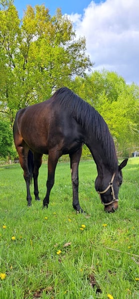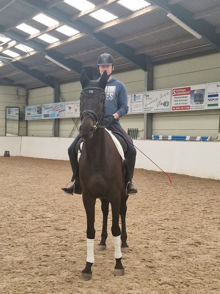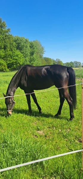 Due to the discontinuation of horse keeping! For sale is a black-brown Oldenburg mare with a current height of 1.80m. She has an elegant appearance and very good potential for dressage. From the very beginning, she showed great talent in her riding training. Her strong willingness to learn and the intelligence she applies underline her equestrian development. She quickly learns new exercises and deepens them for consistent recall. Due to her continuous growth, she was only started under saddle at the age of four and has since been trained slowly and gently according to her growth phases. Currently, she is ridden twice a week and lunged twice a week. The rest of the time, she enjoys spending the whole day in the pasture with another horse. In handling, she is uncomplicated and very well-mannered. Farrier and veterinarian are absolutely no problem. Loading and trailer riding have been practiced several times without difficulties. In January 2025, we had X-rays (small breeder TÜV) taken without findings. All values in the blood test conducted in 2024 were normal. The mare is healthy and stays outside in all weather - without a blanket in summer and also in winter. She is friendly towards other horses - she spent the first four years of her life growing up exclusively in a herd. To prevent riding tourism, we charge 40 euros for trial rides (this will be deducted from the purchase price of the mare).