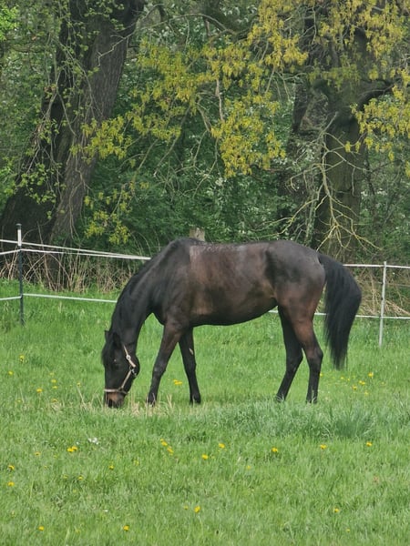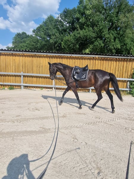 Ze względu na rezygnację z hodowli koni! Na sprzedaż oferujemy czarnobrązową klacz Oldenburską o obecnej wysokości w kłębie 180 cm. Posiada elegancki wygląd i bardzo duży potencjał w sporcie ujeżdżeniowym. Od początku wykazywała duży talent w treningu jeździeckim. Jej chęć do nauki oraz inteligencja podkreślają jej rozwój w jeździe. Szybko przyswaja nowe ćwiczenia i systematycznie je utrwala. Ze względu na swoją wrażliwość nie nadaje się dla początkujących jeźdźców. Ze względu na jej ciągły wzrost, została rozpoczęta pod siodłem dopiero w wieku czterech lat, a następnie była powoli i delikatnie szkolona zgodnie z fazami jej wzrostu. Obecnie jeździ się na niej dwa razy w tygodniu, a dwa razy jest lonżowana. Resztę dnia spędza na pastwisku z innym koniem. Obecnie nie ma założonych kół. W kontaktach jest spokojna i dobrze wychowana. Czyszczenie, weterynarz i kowal nie stanowią dla niej problemu. Załadunek i jazda w przyczepie zostały wielokrotnie przećwiczone bez trudności. W styczniu 2025 roku wykonano jej zdjęcia rentgenowskie (mały przegląd hodowlany) bez stwierdzonych nieprawidłowości. Wszystkie wyniki z badań krwi z 2024 roku były w normie. Klacz jest zdrowa i na zewnątrz niezależnie od pogody – latem bez derki, zimą również. W stosunku do innych koni jest przyjazna – przez pierwsze cztery lata życia wychowywała się wyłącznie w stadzie. Regularnie odrobaczana, zaszczepiona przeciwko tężcowi, grypie, herpesowi oraz wirusowi West Nile (następny termin szczepienia wieloskładnikowego pod koniec października 2025). Aby zapobiec próbom jazdy próbnej, pobieramy opłatę w wysokości 40 euro (zostanie ona odliczona od ceny zakupu klaczy). Klacz jest pod opieką stajni jeździeckiej i pensjonatu koni Arndt w Löbnitz.
