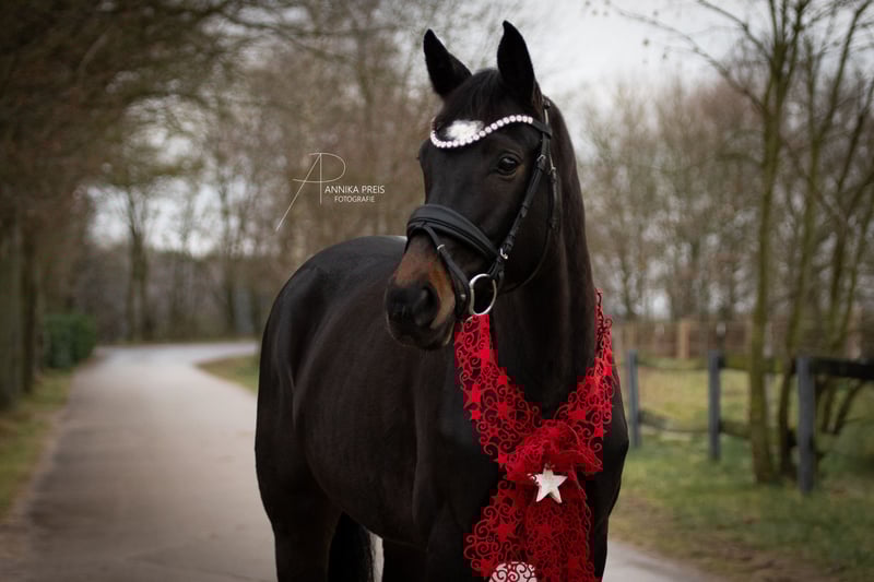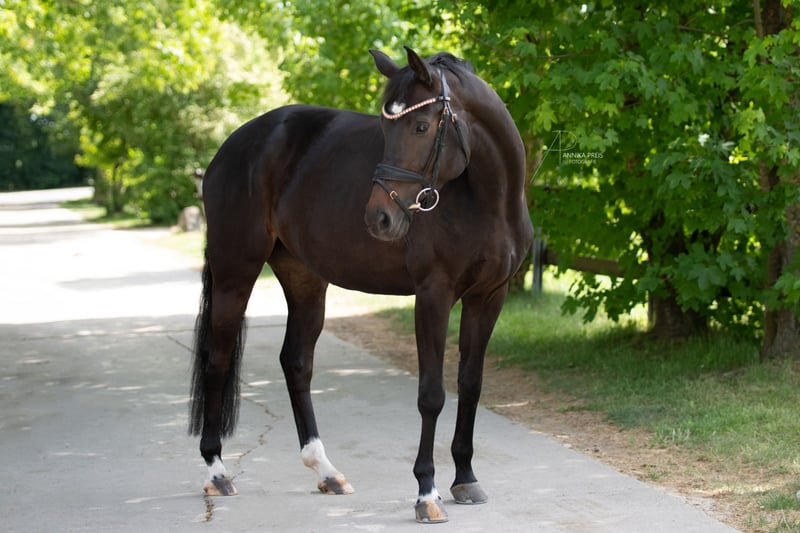 For sale is a 6-year-old Oldenburg mare in a smaller, compact format, who impresses with her charming nature, fine responsiveness, and good basic quality. She is ideal for riders looking for an elegant, sensitive horse that is easy to sit. Sire line – Rubin Royal OLD: Rubin Royal, himself successful at Grand Prix under Hendrik Lochthowe, is considered one of the most valuable riding ability sires of the last two decades. As a son of Rubinstein I and full brother to Romanov, Blue Hors Rockefeller, and other sport greats, Rubin Royal stands for consistent willingness to perform, highest rideability, and strong nerves. He was among the top 1% of the FN breeding value estimation for dressage for many years, produced over 25 licensed sons, and many successful offspring in the S-class. His offspring are characterized by intelligent temperaments, rhythmic movements, and dressage quality up to the highest levels. Dam line – Florencio I: Florencio I was the World Champion of young dressage horses in 2003 and 2004, winning these titles with spectacular scores of up to 10.0 in trot and canter. He combines Dutch rideability lineage (Florestan x Weltmeyer blood) with modern, elastic movements and a clear willingness to perform. Florencio's descendants are successful up to Grand Prix, impressing with elasticity, scope, and intelligence in training. As a maternal grandfather, Florencio I brings valuable rideability impulses and a sporty-modern line to breeding. This pairing results in a harmoniously bred dressage mare that is highly interesting both genetically and athletically. Rubinera was gently started under saddle at five years old and is now at a solid L-level, being carefully introduced to the tasks of the class. She displays a clear line, relaxed movement, and fine contact. Rhythm, back activity, and good cooperation characterize her. She knows small jumps, goes confidently into the terrain with a competent rider, and can be reliably guided into new situations. The training is pressure-free; she shows a willingness to learn and is very sensitive to aids – ideal for riders looking for a sensitive, honest horse with potential. This mare is very sensitive, empathetic, and people-oriented. She responds promptly to light aids and provides her rider with a soft, fine riding feeling. She is not suitable for inexperienced riders – she needs a secure, calm person she can trust. Under the right rider, she is cooperative, honest, and willing to perform. During her mare performance test, she impressed with good quality, rideability, and type, and was awarded the association premium – a clear quality feature for breeding and performance. Due to her lineage, format, and correct conformation, she is also highly interesting for future breeding use. Rubinera is ideal for ambitious leisure riders or dressage riders with feel, who are looking for a small, easy-to-sit, and finely ridden horse. Given her lineage, attitude, and movement, further dressage development is not far off – whether for competitive sports or as a future breeding mare. A small-format, charming Oldenburg mare with proven dressage lineage, very good basic quality, and a clear character. For confident riders looking for a fine, honest horse with perspective.