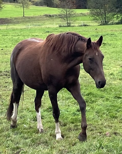 Wegen Bestandsreduzierung bieten wir hier unsere Mia zum Verkauf an. Die Stute ist bei uns in die Zucht gegangen, da sie als Fohlen eine Verletzung hatte. (Fesselbeinfissur) Sie hat zwei bildschöne, korrekte und bewegungsstarke Stutfohlen gebracht. (Können besichtigt werden) 2025 nicht gedeckt, könnte somit in einer der nächsten Rossen besamt werden. Bisher immer beim 1. Versuch tragend, problemlos abgefohlt, gute Mutterstute mit viel Milch. Mia wurde mit guten Noten ins Stutbuch/Hannoveraner aufgenommen. Sie ist Schmiede- und verladefromm, kennt Box sowie Weide/-Zelt. Eventuell auch als Beistellpferd, Bodenarbeit. Leider hat sie bei uns angefangen zu koppen. (Die beiden Jungstuten machen das nicht).