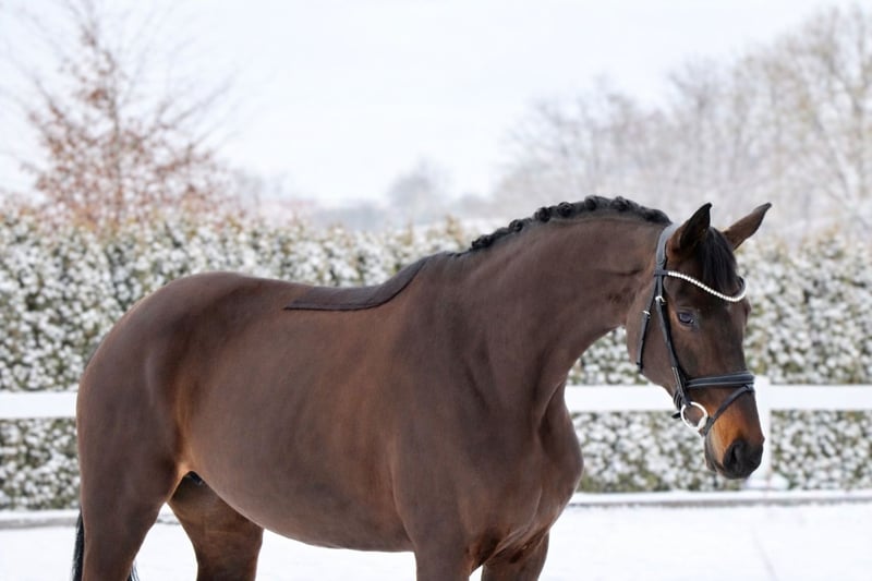 „Goldie“ ist ein Pferd für die Zukunft. Sie hat einen lieben und ruhigen Charakter, ist verträglich in der Herde, dem Menschen gegenüber offen und freundlich und sehr gut erzogen. Dadurch ist sie absolut unkompliziert im Umgang, Schmied, Verladen - alles gar kein Thema. Goldie ist nicht stutig, man merkt keine Rosse o.ä und sie ist nicht stutig oder zu sensibel am Bein! Die Stute kommt direkt vom Züchter zu uns. Goldie ist ansprechend für viele Zielgruppen. Sie ist geeignet für den ambitionierten Dressurreiter der ein Pferd zum Ausbilden und Fördern sucht. Gleichermaßen ist Goldie auch bei einem Amateur super aufgehoben. Durch ihre ruhige und zuverlässige Art geht sie sehr souverän mit dem Reiter und neuen Aufgaben um. Beim Reiten überzeugt Goldie mit ihren herausragenden Grundgangarten und ihrer hohen Reitqualität. Sie geht einfach in Anlehnung, ist sitzbequem und immer lernwillig. Goldie ist fein im Maul und reagiert gut am Sitz, durch diese Eigenschaften lässt sie jeden Reiter gut aussehen. Sie kann Außengalopp, einfache Wechsel, Seitengänge, Travers und springt schon viele sehr gute Wechsel. Da wir uns beim Turnierreiten auf das Springen konzentrieren, war diese tolle Stute noch nicht am Turnier, war aber schon mit auf mehreren Lehrgängen und Auswärtstrainings mit dabei und meisterte das hervorragend! Sie kennt die Arbeit an der Longe und auch Stangen und Gymnastikarbeit und ist dabei immer motiviert und sehr routiniert. Wichtige Hinweise: • Stockmaß-Angaben sind geschätzt und nicht exakt nachgemessen • Alle Beschreibungen sind subjektive Einschätzungen des Verkäufers und keine zugesicherten Eigenschaften • Das Organisieren von einem Transport ins neue Zuhause ist kein Problem! Aktuelle Röntgenbilder ohne Befund sind vorhanden, sowie eine einwandfreie klinische Untersuchung. Bei Interesse und weiteren Fragen melden Sie sich gerne jederzeit telefonisch unter 015140555583. Wir sind auch am Wochenende und an Feiertagen erreichbar. Ein Probereiten ist jederzeit möglich.