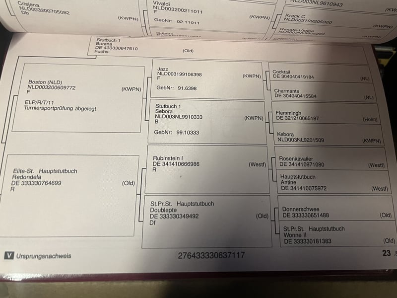 Zum Verkauf steht diese bewegungsstarke Zuchtstute von Indian Rock x Boston x Rubinstein. Im Umgang kopfklar und super menschenbezogen, was sie auch an ihre Nachkommen weitergibt. Ihre erste Tochter ist bereits hocherfolgreich in ihren ersten Reitpferdeprüfungen gewesen, ist dabei super leichtrittig und will gefallen (Videos vorhanden). Aktuell tragend von St. Noblé ( St. Schufro x Sir Donnerhall). Termin 23.03.2026 Verkauf aufgrund von Nachzucht Video der Stute kann auf Anfrage versendet werden TEL.: 0152 21979119