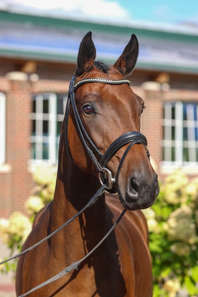 This stunning mare is currently in foal to Federer, who at just seven years old has already won two S-level dressage tests. The expected foaling date is early May. The foal from the same damline (photo) from last year was secured by clients from America. This damline has produced premium stallions such as Fürstbischof and, most recently, Dynamic Plaisir. Additionally, the licensed stallion Bueno SL in Denmark, as well as the Grand Prix horses Sultan des Paluds FRH and Friedolin, also originate from this maternal line.