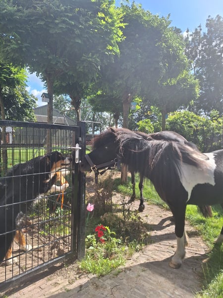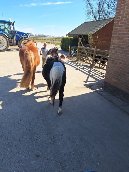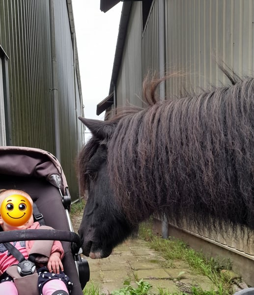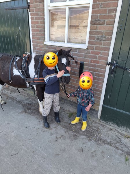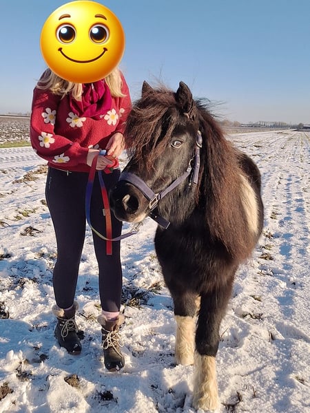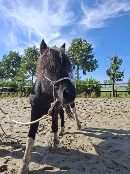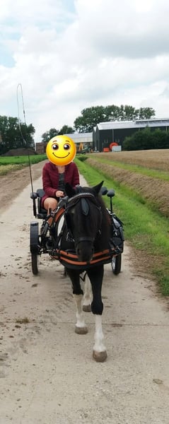 Mijn kleine ondeugd verdiend een plekje waar hij weer de volle aandacht krijgt. Ontmoet Sky, een 14 jarige kruising A pony. Hij is 1,15 m hoog. Hij gaat enkel weg naar een forever home, met de perfecte match. Hij heeft al een plekje in mijn hart heeft veroverd. Nu dat mijn jonge paard is ingereden, heb ik gewoon te weinig tijd om ook nog met hem regelmatig met de sulky weg te gaan. Sky is een aanhankelijke pony, die graag bij je is. Toen hij bij mij kwam had hij heel erg verlatingsangst. Gelukkig met veel geduld, heeft hij daar nu geen last meer van. Natuurlijk hij hinnikt wel als hij alleen is, maar de draden blijven nu heel XD . Hij is een echte eyecatcher. Een mooie zwart bonte ruin met lange manen en een half maanoog, links. Hij houdt van eten dus hij heeft wel regelmatig een buikje, haha. Wat hij het leukste vind? Vooral lekker knuffelen. Grondwerk en voor de sulky. Al heeft meneer een gebruiksaanwijzing. Hij heeft het niet altijd even goed gehad in zijn leven, dus er zitten soms ook dagen tussen dat hij blijft staan en geen stap meer zet of bokt hij. De andere dagen loopt hij dan weer hartstikke leuk voor de sulky. Het liefste gaat hij met andere paarden op pad, hij kan alleen wat onzeker zijn. Als er iemand voor loopt is het prima en als hij zijn dag heeft, kan hij ook wel eens alleen op pad. Toen Sky bij mij kwam was hij enorm kopschuw en bang voor zwepen, daar merk je nu niets meer van. Hij kon geen bit verdragen, dus ben ik met hem bitloos verder gegaan. Ik heb het ook nooit meer geprobeerd om met een bitje te werken. Zonder gaat ook prima. Misschien kan dat wel weer inmiddels, maar voor mij was het niet nodig. Hij is niet snel bang. Grote landbouwvoertuigen, snel langs rijdende auto’s etc. is geen probleem, maar als hij niet lekker in zijn vel zit kan hij wel alles gebruiken om van te schrikken als hem dat uitkomt. Hij is ook beleerd, maar onder het zadel is hij wispelturig. Hij loopt liever voor de sulky of grondwerk. Vrij springen vind hij helemaal geweldig. Erop zitten in de wei, gewoon voor de gezelligheid. Vind hij ook prima, dan is hij met kleine kinderen erop vertrouwd. Van het fanatiek rijden is hij minder gecharmeerd. NIET GESCHIKT VOOR BEGINNERS! Alleen voor een zekere ruiter, die hem durft aan te pakken op een liefdevolle maar duidelijke manier. Sky is sinds 2015 bij mij. Ik heb hem zien uitgroeien van een angstig en onzeker jong paardje, naar een pony die geniet van het leven. Die zich goed voelt en graag de macho van de kudde is. Hij is niet zomaar een pony, hij is uniek. Soms kun je hem wel achter het behang plakken en soms kun je enorm hard om hem lachen. Sky zoekt een baasje die er tegen kan dat geen dag hetzelfde is met hem. Die hem een warm thuis kan geven, met een kudde waar hij zijn plekje in kan vinden. Hij heeft andere paarden om hem heen nodig, waarmee hij op pad mag. Wanneer hij merkt dat we naar het bos gaan, gaat hij harder lopen. Daar geniet hij zichtbaar van. Ik gun hem zo een forever home waar hij meer aandacht krijgt, dan wat ik hem op het moment geef. Het is namelijk een echte lieverd. Het is voor hem niet eerlijk altijd laatste keuze te zijn. Maar goed hij is gelukkig hier en vermaakt zich ook prima in de weide en de rondjes met de sulky, dus hij hoeft niet perse weg. Hij staat nu altijd buiten, daar gedijd hij het beste bij. Uiteraard met een schuilmogelijkheid en een kudde die ook gezellig buiten met hem wil spelen. Want spelen doet hij ook graag. Ga jij glimlachen als je dit leest? Je mag altijd een keertje komen kijken en met hem knuffelen. Wie weet is Sky wel de pony voor jou. Hij is altijd op tijd ingeënt, ontwormt(wanneer nodig) en naar de hoefsmid geweest. Het is een gezonde en fitte pony, met nu wel iets te veel vetjes misschien (a). Er is een mogelijkheid om zijn tuig(zadel&hoofdstel+sulky tuig) en de sulky ook over te nemen.
