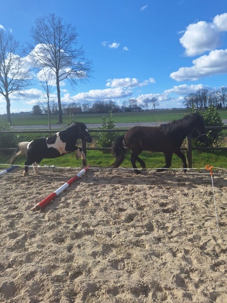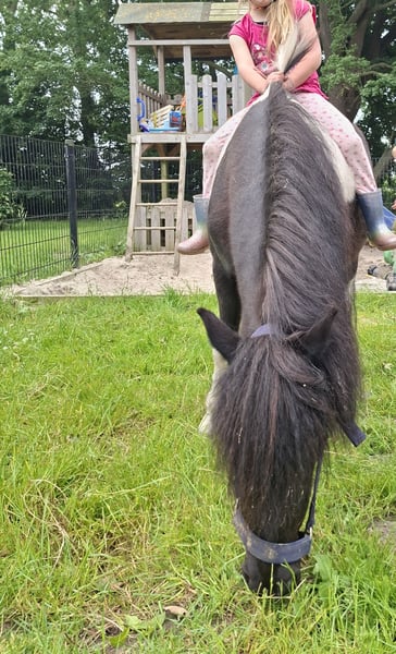 Mein kleiner Schelm verdient einen Platz, an dem er wieder volle Aufmerksamkeit erhält. Lernen Sie Sky kennen, einen 14-jährigen Kreuzungs-Pony A. Er ist 1,15 m groß. Er wird nur in ein dauerhaftes Zuhause vermittelt, das perfekt zu ihm passt. Er hat bereits mein Herz erobert. Da mein junges Pferd nun eingeritten ist, habe ich einfach zu wenig Zeit, um auch regelmäßig mit ihm mit der Sulky unterwegs zu sein. Sky ist ein anhängliches Pony, das gerne bei dir ist. Als er zu mir kam, litt er sehr unter Trennungsangst. Glücklicherweise hat er mit viel Geduld keine Probleme mehr damit. Natürlich hinnert er, wenn er allein ist, aber die Fäden bleiben jetzt ganz XD. Er ist ein echter Blickfang. Ein wunderschöner schwarz-bunter Hengst mit langen Mähnen und einem halb Maanoog, links. Er liebt Essen, daher hat er manchmal einen kleinen Bauch, haha. Was mag er am liebsten? Vor allem Kuscheln! Bodenarbeit und Fahrten mit der Sulky. Allerdings hat Herrchen eine Gebrauchsanweisung. Er hat in seinem Leben nicht immer das Beste erlebt, deshalb gibt es auch Tage, an denen er stehen bleibt, keinen Schritt mehr macht oder bockt. An anderen Tagen läuft er wieder wunderbar vor der Sulky. Am liebsten unternimmt er Ausritte mit anderen Pferden, er kann allein etwas unsicher sein. Wenn jemand vor ihm geht, ist das kein Problem, und wenn er einen guten Tag hat, kann er auch mal alleine unterwegs sein. Als Sky zu mir kam, war er sehr kopfscheu und hatte Angst vor Peitschen, das ist heute kaum noch zu merken. Er konnte kein Gebiss vertragen, daher bin ich mit ihm gebisslos weitergeritten. Ich habe nie wieder versucht, mit einem Gebiss zu arbeiten. Ohne geht auch prima. Vielleicht ist das inzwischen wieder möglich, aber für mich war es nicht notwendig. Er ist nicht leicht zu erschrecken. Große landwirtschaftliche Fahrzeuge, schnell vorbeifahrende Autos etc. sind kein Problem. Wenn er sich jedoch nicht wohl fühlt, kann er alles nutzen, um vor Schreck zu springen. Er ist auch eingeritten, aber unter dem Sattel ist er launisch. Er läuft lieber vor der Sulky oder bei Bodenarbeit. Springen über Hindernisse findet er super. Im Offenstall auf dem Rücken zu sitzen, ist für ihn auch in Ordnung, einfach zum Spaß. Das findet er auch prima, dann ist er mit kleinen Kindern vertraut. Für intensives Ritten ist er weniger geeignet. NICHT FÜR ANFÄNGER GEEIGNET! Nur für einen sicheren Reiter, der ihn liebevoll, aber bestimmt behandelt. Sky ist seit 2015 bei mir. Ich habe ihn vom verängstigten und unsicheren jungen Pferd zu einem Pony entwickelt, das das Leben genießt. Er fühlt sich wohl und ist gern der Macho in der Herde. Er ist kein gewöhnliches Pony, sondern einzigartig. Manchmal kann man ihn kaum ertragen, manchmal bringt er einen zum Lachen. Sky sucht eine Besitzerin oder einen Besitzer, der damit umgehen kann, dass mit ihm kein Tag wie der andere ist. Der ihm ein warmes Zuhause geben kann, in einer Herde, in der er seinen Platz findet. Er braucht andere Pferde um sich, mit denen er unterwegs sein kann. Wenn er merkt, dass wir in den Wald reiten, wird er schneller. Das genießt er sichtbar. Ich wünsche ihm so sehr ein dauerhaftes Zuhause, in dem er mehr Aufmerksamkeit bekommt, als ich ihm momentan geben kann. Er ist nämlich ein echtes Herzchen. Es ist für ihn nicht fair, immer nur die letzte Wahl zu sein. Aber er ist glücklich hier und vergnügt sich auch bestens auf der Weide und bei den Runden mit der Sulky, sodass er nicht unbedingt weg muss. Er steht momentan immer draußen, dort fühlt er sich am wohlsten. Natürlich mit einem Unterstand und einer Herde, die auch gerne draußen mit ihm spielen. Denn spielen liebt er auch. Lächelst du, wenn du das liest? Du bist jederzeit herzlich eingeladen, vorbeizukommen und mit ihm zu kuscheln. Vielleicht ist Sky ja das Pony, das du gesucht hast. Er ist immer pünktlich geimpft, entwurmt (wenn nötig) und beim Hufschmied gewesen. Er ist ein gesundes und fittes Pony, vielleicht hat er momentan ein bisschen zu viel Fett (a). Es besteht die Möglichkeit, sein Geschirr (Sattel, Zaumzeug + Sulky-Geschirr) sowie die Sulky zu übernehmen.