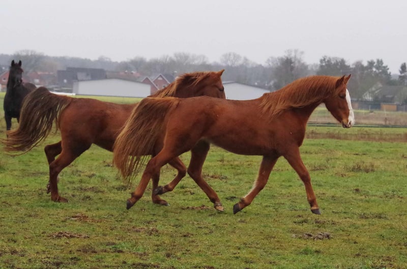 Devlyn is such a friendly horse that it is hard to put into words. She does everything for her person and enjoys every form of attention. Although we haven't properly trained her yet, we have already taken her on a few rides. The first time we took her out was because she really wanted to join us. We saddled her up, led her a few steps with the saddle, lured her to the mounting block with a treat, got on and off three times, and then rode her out as a lead horse. We crossed a stream and returned. That was about two kilometers, and she was absolutely sweet and cooperative. There is a video of this on our Instagram. You have to scroll a bit to find it; it was on January 16th. Devlyn is an exceptional character, for whom humans are the most important thing. Our horses are only sold to homes where they have the opportunity to move freely with other horses 24 hours a day. It is important to us to have enough space for each horse to gallop in the paddock even in winter, sufficient feeding places for the number of planned horses, appropriate companionship around the clock, and a shelter that provides soft lying areas and weather protection at all times of the year. Additionally, it is important to us that our horses continue to be adequately dewormed several times a year and receive immunization against tetanus. When you contact us, we will ask you for pictures of your horse keeping arrangements to see if the appropriate conditions are met for the respective horse. This way, we ensure that our horses remain friendly, engaged, and healthy partners for you in the future. Sustainable horse sales are a matter close to our hearts.