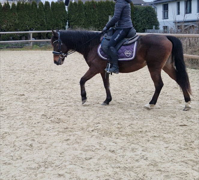 In unserer Elly steckt ein ganz tolles Pony - es benötigt allerdings etwas Zeit und Vertrauen dies herauszukitzeln, denn sie sagt erstmal zu allem nein, ist unsicher und fremde Menschen sind erst recht blöd. Gibt man ihr genügend Zeit, Sicherheit und konsequent Regeln vor, ist sie gut zu händeln - auch von erfahrenen älteren Kindern. Sie ist sehr lernwillig bei der Bodenarbeit, beim reiten sehr fein an den Hilfen. Sie bringt bei beidem etwas "go" mit. Im Gelände zeigt sie sich mit viel Routine entspannt - nur vor LKW's, Treckern oder großen Anhängern hat sie Angst, das kann man aber sicherlich sehr gut mit ihr üben. Elly ist sehr rangniedrig und kennt 24/7 draußen sein, sowie Nachts Box. Beim Hufschmied zeigte sie sich bisher immer brav und kooperativ und auch das verladen und Fahren zu uns ging ohne Probleme. Sie ist ungefähr 10 Jahre alt und 1,40m groß Leider müssen wir der süßen einen neuen Platz suchen, da sie durch den Reiterwechsel in der Reitpädagogik massiv gestresst ist. Ein Handycap bringt sie leider noch zusätzlich mit: als wir Elly im Sommer 2025 übernommen haben, teilte uns unser Hufschmied mit, dass sie wohl 2024 mal Hufrehe hatte - uns wurde leider dazu nichts mitgeteilt. Bei der Vorbesitzerin stand sie ganztägig auf der Wiese, bei uns vorsichtshalber nur stundenweise und hat angepasstes Futter bekommen. Bei Interesse freue ich mich auf eine Nachricht, weitere Videos auf Anfrage