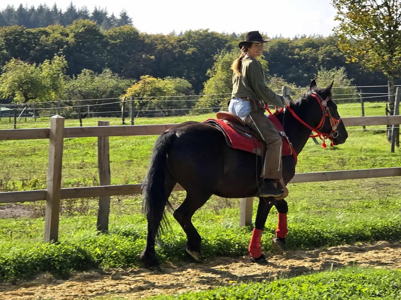 Jument noire – sociable et conviviale Âge : 3,5 ans Taille : environ 1,53 m Prix : 6500,- Vétérinaire disponible Elle est : – douce et fiable au quotidien ainsi que sous la selle – très attachée aux humains et câline – équilibrée et calme malgré son jeune âge – un excellent cheval pour toute la famille – avec son caractère, également intéressante pour le domaine de l'équitation thérapeutique Parfait pour : Familles, cavaliers de loisir ou établissements à la recherche d'un cheval amical et coopératif, qui aime le contact humain. Nos chevaux : – régulièrement vermifugés – suivis par le maréchal-ferrant et l'ostéopathe Magasin à la ferme : Selles western, brides, accessoires Transport et accessoires organisés à prix réduit sur demande Notre service : ✅ Droit de retour de 3 mois ✅ Essai : 35 €, chaque cheval supplémentaire 25 € (déduit lors de l'achat le même jour) ✅ Remise immédiate de 100 € pour enlèvement/transport le même jour ✅ Conseil personnel et honnête Pour les demandes, veuillez appeler uniquement : 0171 – 4001968 Disponible tous les jours de 8h à 20h ⚠️ Pas d'e-mail ou WhatsApp ⚠️ Toutes les informations sans garantie