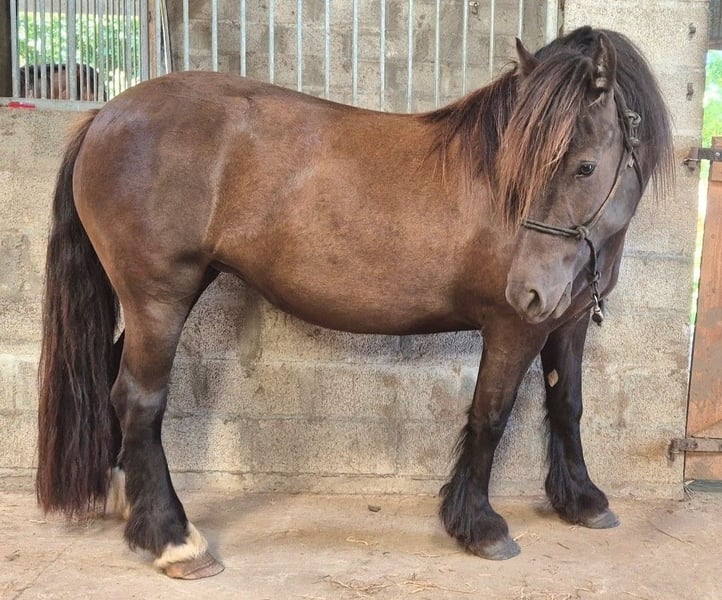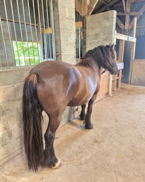 🦄 Jument Irish Cob PP noire - bientôt 5 ans (07/2026) - âme sensible & coeur immense 🌏Visible actuellement à Quéménéven. Possibilité de rester à la pension après achat (carrière et chemins de balades) Environ 1m40, porteuse. Plein papier, père Irish Cob IRL élite, très belle lignée maternelle (San Cler, mère et grand-mère isabelle → beaux poulains possibles). 📸Photos des parents sur demande 💫Très bonnes bases en travail à pied (pro) : déplacements, cessions, désensibilisation (bâche, drapeau, véhicules…). 💫Débourrage en cours avec professionnelle : monte au montoir sans bouger, 3 allures (galop en perfectionnement), arrêt d’urgence, directions. Elle est très fine aux aides (voix, assiette). Sa curiosité fait d'elle une jument volontaire et intelligente. 🌿Sort en extérieur seule, encore sensible émotionnellement → idéal accompagnée au début. Douche OK, van OK, longues rênes connues. Vie au pré H24 en troupeau, n'aime pas le box fermé. Très proche de l’humain, facile à attraper (vient quand on l'appelle). Clôtures solides nécessaires (elle est maligne 😅). À jour maréchal, vaccins, vermifuge, ostéo, dentiste. Pieds nus, RAS santé. (Concernant les fanons, la boue a persisté longtemps par chez moi, même en période estivale, se qui n'aide pas à la repousse. Mais elle a de très bons pieds et n'a jamais fait de gale de boue.) Convient à cavalier expérimenté jeune cheval. Recherche famille ⭐️⭐️⭐️⭐️⭐️ 💰 45🥕🥕 Prix en adéquation avec ses belles origines ainsi que la qualité du travail fait avec elle 📩 Infos et photos sur demande en MP