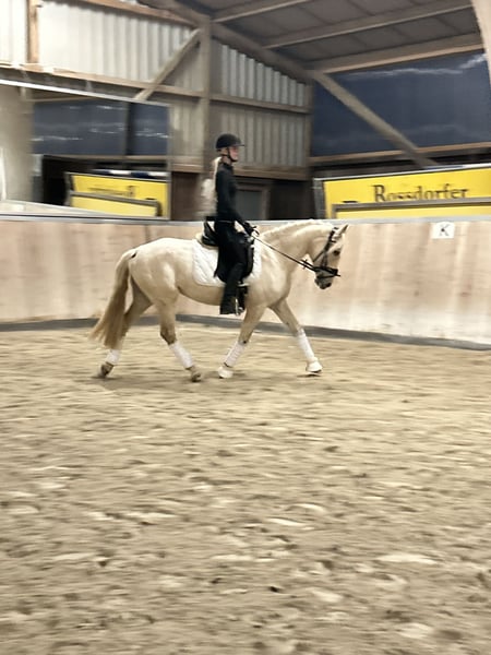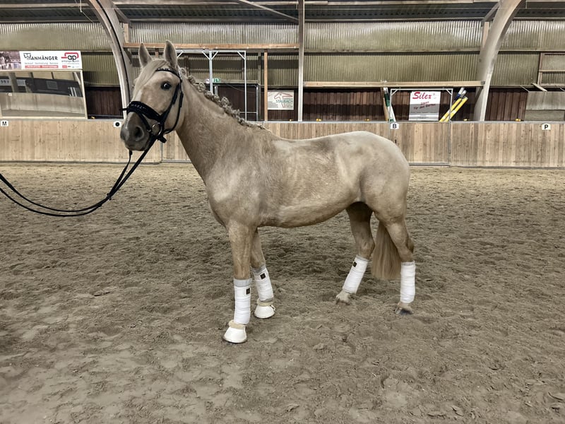 Unsere bezaubernde Palomino-Stute (4 Jahre, ca. 1,47 m) sucht ein liebevolles Zuhause, in dem sie mit Geduld, Zeit und Vertrauen in Ruhe weiter gefördert wird. Sie ist ein Pferd mit viel Herz, Charme und Charakter – eine echte Persönlichkeit, die ihren Menschen fürs Leben finden möchte. Diese Stute ist menschenbezogen, verschmust und sehr aufmerksam. Sie liebt es, im Mittelpunkt zu stehen, sucht Nähe und möchte gefallen. Dabei braucht sie jemanden mit Erfahrung, Gefühl und Geduld, der ihr Sicherheit schenkt und sie liebevoll, aber konsequent führt. Hat sie einmal Vertrauen gefasst, geht sie mit ihrem Menschen durchs Feuer. Sie befindet sich derzeit auf einem soliden A-Niveau in der Dressur und zeigt dort wie auch am Sprung viel Freude und Talent. Sie arbeitet gerne, lernt schnell und möchte gefordert werden – Stillstand ist nichts für sie. Ihr erstes kleines Turnier im Führzügel hat sie mit Bravour gemeistert, und auch im Gelände zeigt sie sich mutig, interessiert und nervenstark, solange sie Rückhalt von ihrer Reiterin bekommt. Sie lebt derzeit im Offenstall in gemischter Herde, wo sie sich sozial zeigt, aber ranghöher steht. Auch Boxenhaltung kennt sie. Sie ist gesund, robust, regelmäßig entwurmt, dem Schmied vorgestellt und läuft barfuß ohne Probleme. Ein echtes Herzenspferd mit Ausstrahlung und Arbeitsfreude Viel Potenzial für Dressur, Springen oder vielseitige Freizeitgestaltung Sehr menschenbezogen, sensibel und lernwillig Auch als Zuchtstute interessant Auf Wunsch kann ein passender Sattel gegen Aufpreis miterworben werden Ein Probereiten ist nach Absprache möglich (Gebühr 25 €). Die Stute wird ausschließlich in liebevolle, fördernde Hände abgegeben, da sie bei uns ihr Potenzial nicht voll entfalten kann. Sie ist kein Pferd für jedermann – aber das perfekte Pferd für den Menschen, der ihr Herz gewinnt.