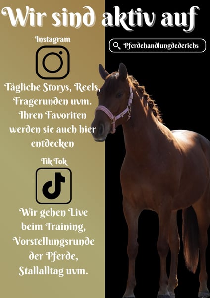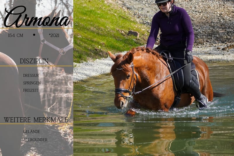 Armona ist eine 5 Jährige Karakachan Stute v. Ayran B ca. 154 cm *Armona* ist eine wunderschöne ganz coole Allrounderin. Sie arbeitet super schön auf dem Platz mit, zeigt sich rittig mit sehr schönen GGA. Im Gelände geht sie brav alleine und in der Gruppe auch fremde Umgebungen machen ihr nichts aus. Sie zeigt Freude auch an einem Sprung und springt auch gerne mit uns über Baumstämme. Armona liebt das Wasser und geht super gerne plantschen. Eine Allrounderin durch und durch. Wir können uns sie auch für den Schulbetrieb gut vorstellen. Im Umgang super lieb und unkompliziert. Ein aktuelles Video finden Sie hier in der Anzeige. Pferdehandlung Dederichs – Ihr Partner für den Pferdekauf Kontakt & Erreichbarkeit: Anfragen bitte ausschließlich telefonisch unter 0173/9792139 Montag – Freitag: 09:00 – 18:00 Uhr Samstag: 09:00 – 15:00 Uhr Sonntag: Ruhetag Folgen Sie uns auf Social Media! Erleben Sie unseren Alltag mit den Verkaufspferden auf Instagram, TikTok & Facebook unter Pferdehandlung Dederichs Rabatt: Bei sofortiger Mitnahme Ihres neuen Traumpferdes erhalten Sie zwischen 5 %– 10 % Rabatt Probereiten & Vorführen: • Probereiten: 40 € pro Pferd (max. 2 Reiter), Betrag wird beim Kauf angerechnet • Feiertage: Proberitt 50 € • Vorführung durch unsere Bereiter: 30 € pro Pferd (Vorreiten, Bodenarbeit etc.) Ankaufsuntersuchung & Transport: • Viele unserer Pferde besitzen bereits eine AKU • Sie können selbstverständlich Ihren eigenen Tierarzt mitbringen • Gerne organisieren wir eine Untersuchung • Wir unterstützen Sie auch gerne beim Transport ins neue Zuhause Weitere Verkaufspferde: In unserem Stall stehen weitere Verkaufspferde, die noch nicht online sind. Falls Ihr Traumpferd noch nicht dabei ist, zögern Sie nicht, uns zu kontaktieren. Wichtige Hinweise: • Stockmaß-Angaben sind geschätzt und nicht exakt nachgemessen • Alle Beschreibungen sind subjektive Einschätzungen des Verkäufers und keine zugesicherten Eigenschaften