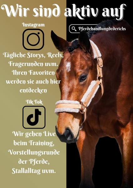 Burgundy ist eine 5 Jährige Stute ca. 155 cm v. City Light x Choisir *Burgundy* ist eine super schicke und ganz coole Stute mit super Charakter. Geht in Bahn und Gelände, zeigt Talent am Sprung und ist somit eine super Allrounderin. Sie ist super cool und unerschrocken ob, Baustellenfahrzeuge, Lärm, Planen, Straßenverkehr. Fremde Umgebungen machen ihr auch nichts aus. Ein Traumpferdchen. Wir können uns sie auch für Schulbetriebe und Jugendliche vorstellen. Im Umgang gut erzogen und unkompliziert. Sie bringt bereits eine gute aktuelle AKU mit. Pferdehandlung Dederichs – Ihr Partner für den Pferdekauf Kontakt & Erreichbarkeit: Anfragen bitte ausschließlich telefonisch unter 0173/9792139 Montag – Freitag: 09:00 – 18:00 Uhr Samstag: 09:00 – 15:00 Uhr Sonntag: Ruhetag Folgen Sie uns auf Social Media! Erleben Sie unseren Alltag mit den Verkaufspferden auf Instagram, TikTok & Facebook unter Pferdehandlung Dederichs Rabatt: Bei sofortiger Mitnahme Ihres neuen Traumpferdes erhalten Sie zwischen 5 %– 10 % Rabatt Probereiten & Vorführen: • Probereiten: 40 € pro Pferd (max. 2 Reiter), Betrag wird beim Kauf angerechnet • Feiertage: Proberitt 50 € • Vorführung durch unsere Bereiter: 30 € pro Pferd (Vorreiten, Bodenarbeit etc.) Ankaufsuntersuchung & Transport: • Viele unserer Pferde besitzen bereits eine AKU • Sie können selbstverständlich Ihren eigenen Tierarzt mitbringen • Gerne organisieren wir eine Untersuchung • Wir unterstützen Sie auch gerne beim Transport ins neue Zuhause Weitere Verkaufspferde: In unserem Stall stehen weitere Verkaufspferde, die noch nicht online sind. Falls Ihr Traumpferd noch nicht dabei ist, zögern Sie nicht, uns zu kontaktieren. Wichtige Hinweise: • Stockmaß-Angaben sind geschätzt und nicht exakt nachgemessen • Alle Beschreibungen sind subjektive Einschätzungen des Verkäufers und keine zugesicherten Eigenschaften