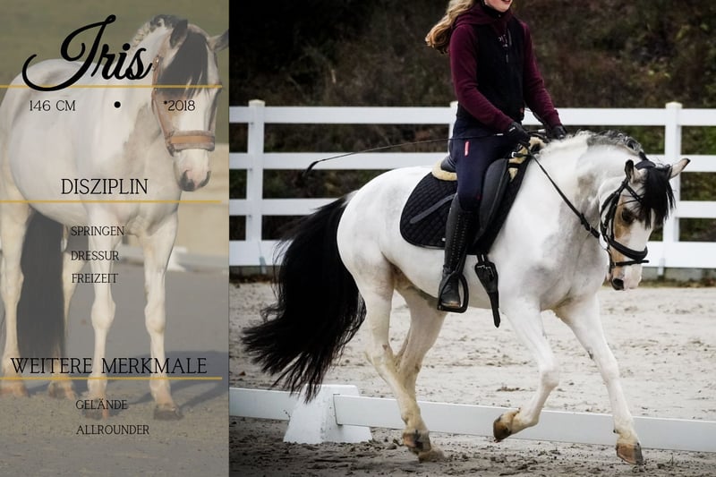 Iris ist eine 2018 geborene Ponystute ca. 146 cm *Iris* bildschöne und super coole Allrounderin. Diese wunderschöne Stute hat bereits Turniererfahrung und ist mit Kindern gestartet. Sie lässt sich super schön reiten und ist am Sprung ganz einfach zu reiten. Sie macht jedes Gelassenheitstraining super cool mit und lässt sich auch auf Halsring reiten. Im Gelände geht sie auch super brav, selbst in fremder Umgebungen. Iris springt auch über Baumstämme. Ein absolutes Allroundpony. !!! SCHAUEN SIE SICH UNBEDINGT IHR VIDEO AN !!! Im Umgang ist sie auch super süss. Ein Traumpony durch und durch. Ein aktuelles Video finden Sie hier in der Anzeige oder unter folgendem Link: https://www.youtube.com/watch?v=LqZskOqW_vQ Pferdehandlung Dederichs – Ihr Partner für den Pferdekauf Kontakt & Erreichbarkeit: Anfragen bitte ausschließlich telefonisch unter 0173/9792139 Montag – Freitag: 09:00 – 18:00 Uhr Samstag: 09:00 – 15:00 Uhr Sonntag: Ruhetag Folgen Sie uns auf Social Media! Erleben Sie unseren Alltag mit den Verkaufspferden auf Instagram, TikTok & Facebook unter Pferdehandlung Dederichs Rabatt: Bei sofortiger Mitnahme Ihres neuen Traumpferdes erhalten Sie zwischen 5 %– 10 % Rabatt Probereiten & Vorführen: • Probereiten: 30 € pro Pferd (max. 2 Reiter), Betrag wird beim Kauf angerechnet • Feiertage: Proberitt 50 € • Vorführung durch unsere Bereiter: 25 € pro Pferd (Vorreiten, Bodenarbeit etc.) Ankaufsuntersuchung & Transport: • Viele unserer Pferde besitzen bereits eine AKU • Sie können selbstverständlich Ihren eigenen Tierarzt mitbringen • Gerne organisieren wir eine Untersuchung • Wir unterstützen Sie auch gerne beim Transport ins neue Zuhause Weitere Verkaufspferde: In unserem Stall stehen weitere Verkaufspferde, die noch nicht online sind. Falls Ihr Traumpferd noch nicht dabei ist, zögern Sie nicht, uns zu kontaktieren. Wichtige Hinweise: • Stockmaß-Angaben sind geschätzt und nicht exakt nachgemessen • Alle Beschreibungen sind subjektive Einschätzungen des Verkäufers und keine zugesicherten Eigenschaften Weitere Informationen finden Sie unter: www.Pferdehandlung-Dederichs.de
