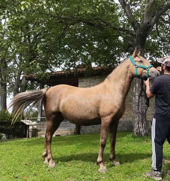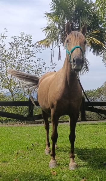 Te presento a Luna, una yegua Luso-árabe (75%-25%), palomina tostada de imponente presencia (capa poco común). Sobre el 1'56 m de alzada y de complexión fuerte. En edad perfecta para domar, 6 años. Esta ramaleada y acostumbrada al trato humano.