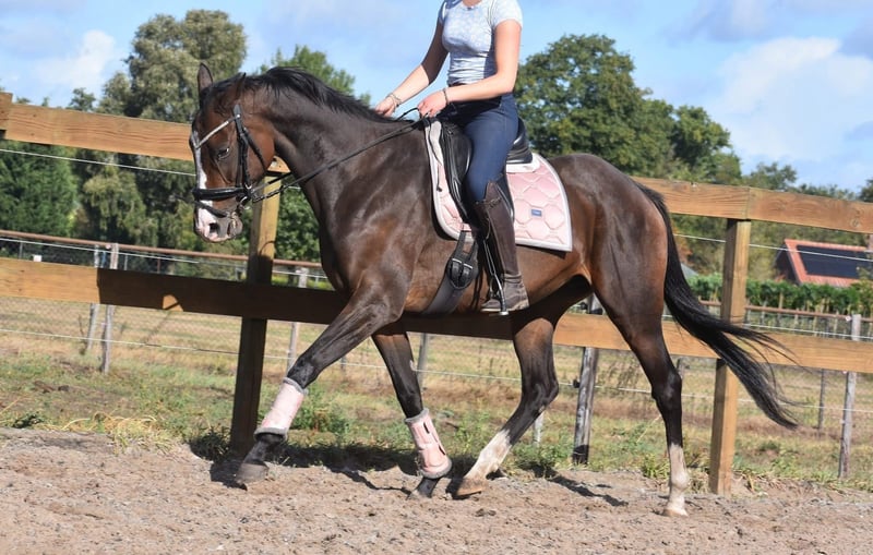 Paddy ist eine 9-jährige Dame mit einer Größe von ca. 1,62 m, abstammend von Leading Light x Caoba by Hernando (FR). Sie verfügt über eine elegante, aber dennoch solide Konstitution mit schönen, langen Beinen und lässt sich hier angenehm reiten. Paddy ist keineswegs faul und arbeitet gerne für ihren Reiter. Dabei hat sie ein weiches Maul und reagiert fein auf die Hilfen. Bei ihr ist kein strenger Zügelgebrauch erforderlich. Sie ist verkehrssicher, gesund und frei von Mängeln. Für die Zucht ist sie ebenfalls äußerst interessant! Kürzlich vom Tierarzt behandelt, liegt ein aktueller Befund vor. Preis 5950 € inklusive Markenreitsattel und Abschwitzdecke.
