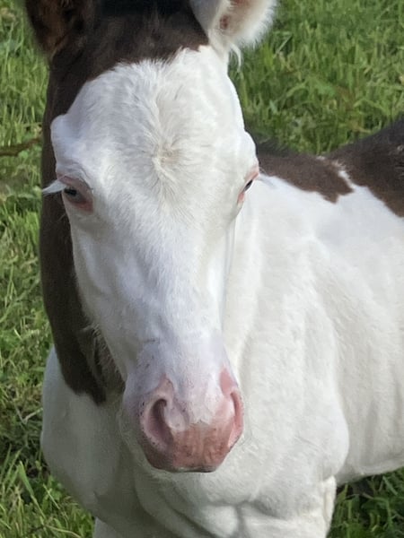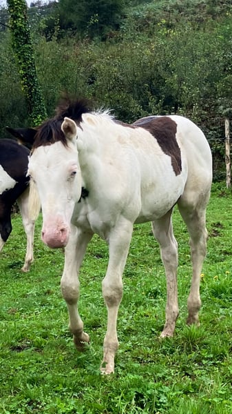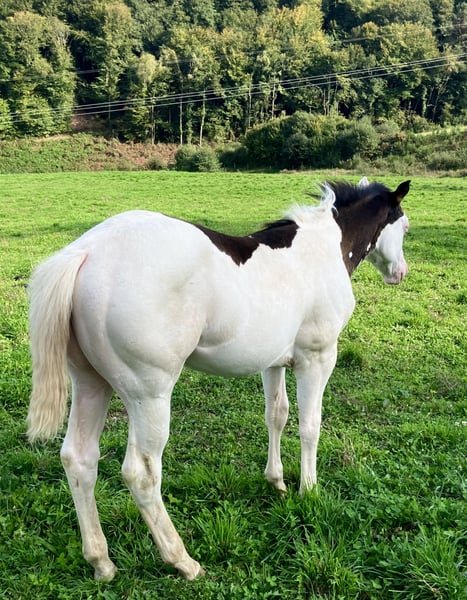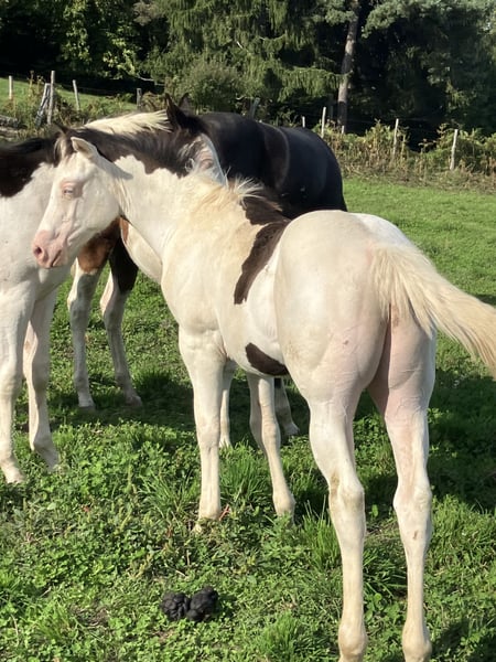PHB PHANTOM MACHO GUN( Ee aa SW1/SW1 DW20/DW20 et 7 panels negatifs !!) PAINT HORSE noir splash pleins papiers US et FR né le 22 mai 2025. PHANTOM est négatif au frame overo,homozygote splash et homozygote dw20 , un candidat parfait pour faire un futur étalon, étant donné qu’il est l’un des 1 ers produits de notre Etalon importé du Canada( LOVERSEA SPLASHY GUN, lignée colonels smoking gun), avec une conformation massive et musculeuse par les 2 parents Zita comme Loversea. Sa mère est une grande et grosse Jument, avec un peu de halter dans son pedigree, elle a l’habitude de nous faire de magnifiques poulains très bien conformés. Son père est un Paint 75%quarter horse, arrière petit fils de Colonels smoking gun, nous l’avons du Canada, un très bon mental, grosse morphologie , mais avec de la puissance et de la rapidité. Nos chevaux sont élevés en troupeau, avec les étalons, et une partie d’entre eux est montée en loisirs, l’éducation des poulains se fait naturellement, ils suivent leur mères en randonnée, ont tous les codes sociaux de la vie en communauté entre chevaux, les poulains sont sevrés vers sept mois et éduqués à marcher en longe, à monter en transport, à donner les pieds, au maréchal , ils sont aussi régulièrement vermifugés et correctement vaccinés avant leur départ. localisation FRANCE, Corrèze. Disponible à la réservation, pourra partir à partir de décembre 2025.