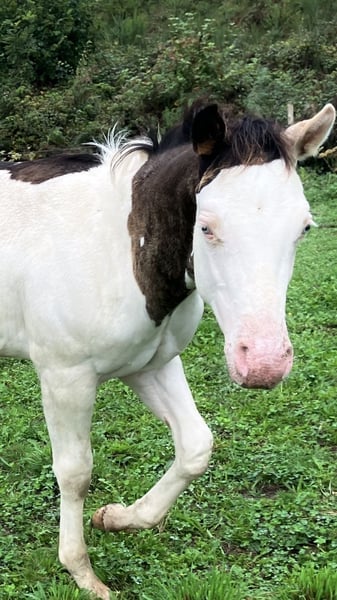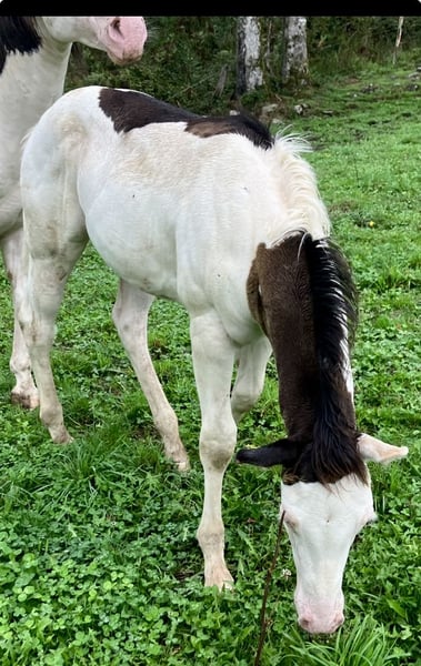 PHB PHANTOM MACHO GUN (Ee aa SW1/SW1 DW20/DW20 i 7 paneli negatywnych!!) KONIK PAINT czarny splash, pełne papiery US i FR, urodzony 22 maja 2025 roku. PHANTOM jest negatywny na frame overo, homozygotyczny splash i homozygotyczny dw20, idealny kandydat na przyszłego ogiera, biorąc pod uwagę, że jest jednym z pierwszych potomków naszego ogiera importowanego z Kanady (LOVERSEA SPLASHY GUN, linia Colonels Smoking Gun), z masywną i muskularną konformacją po obu rodzicach Zita i Loversea. Jego matka to duża i mocna klacz, z odrobiną haltera w swoim rodowodzie, która regularnie rodzi nam wspaniałe źrebaki o bardzo dobrej konformacji. Jego ojciec to Paint 75% quarter horse, prawnuk Colonels Smoking Gun, którego przywieźliśmy z Kanady, o bardzo dobrym temperamencie, dużej morfologii, ale z mocą i szybkością. Nasze konie są hodowane w stadzie, z ogierami, a część z nich jest użytkowana rekreacyjnie, edukacja źrebaków odbywa się naturalnie, podążają za swoimi matkami na wycieczkach, mają wszystkie społeczne normy życia w grupie koni, źrebaki są odsadzone około siódmego miesiąca życia i uczone chodzenia na lonży, wsiadania do transportu, podawania kopyt, u kowala, są również regularnie odrobaczane i odpowiednio szczepione przed wyjazdem. Lokalizacja: FRANCJA, Corrèze. Dostępny do rezerwacji, może wyjechać od grudnia 2025 roku.