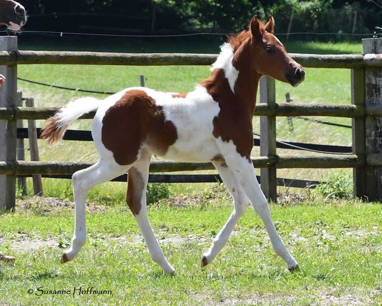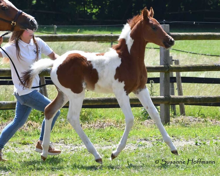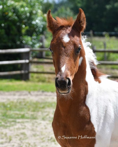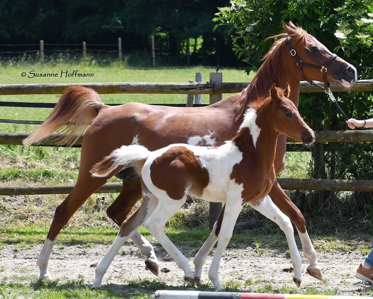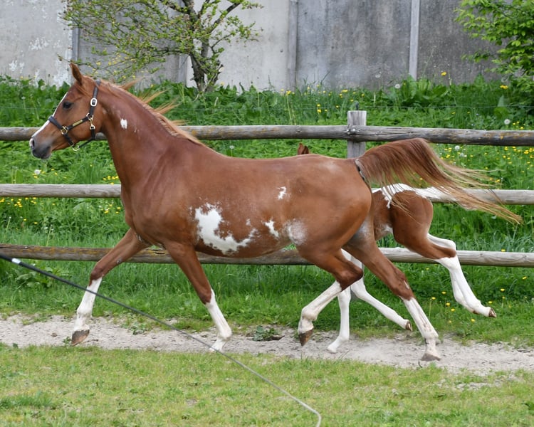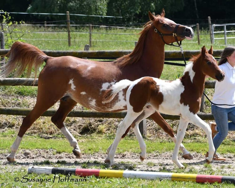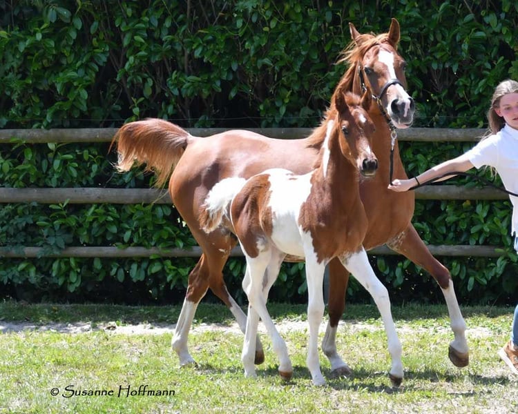 Our Levanto is an Arabian Partbred colt who, in addition to his Arabian charm, particularly impresses with his excellent riding horse qualities. He is also a dream in terms of character, very cooperative and people-oriented, and super curious. In his movement, he shows himself to be very balanced and spacious, with not too much upward thrust, which makes him particularly interesting for endurance riding, but leisure riders also appreciate comfortable movements. The pictures show him just a few days old, and then about 6 weeks old during the inspection appointment. Following that is a photo of his mother and finally some pictures of his father, the USA-imported Pintabian performance stallion SH Secret Legacy. Feel free to make an appointment with us to meet this wonderful boy and our other foals.