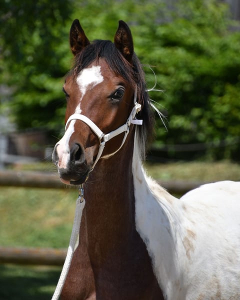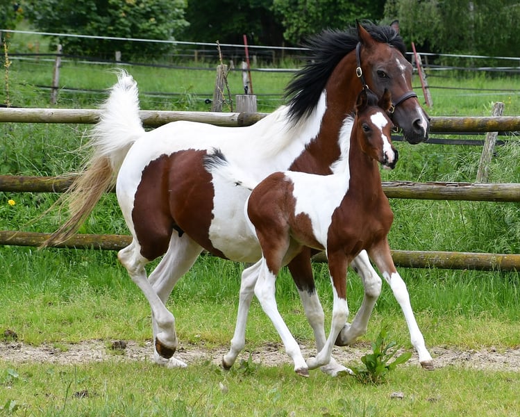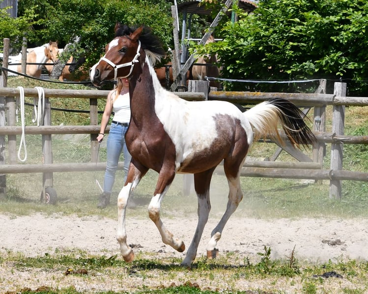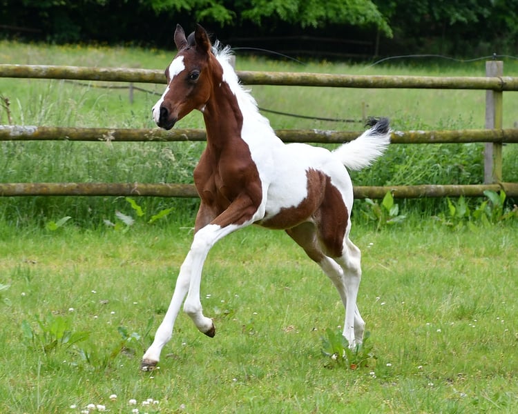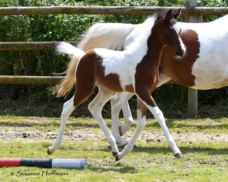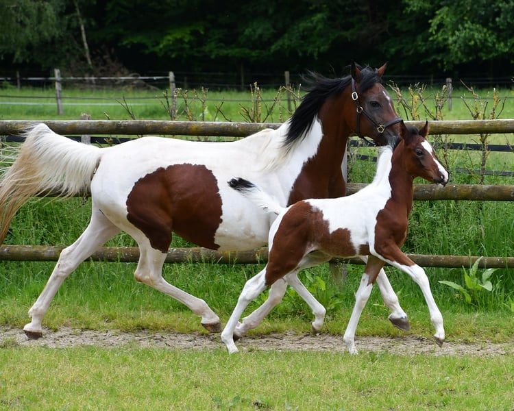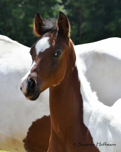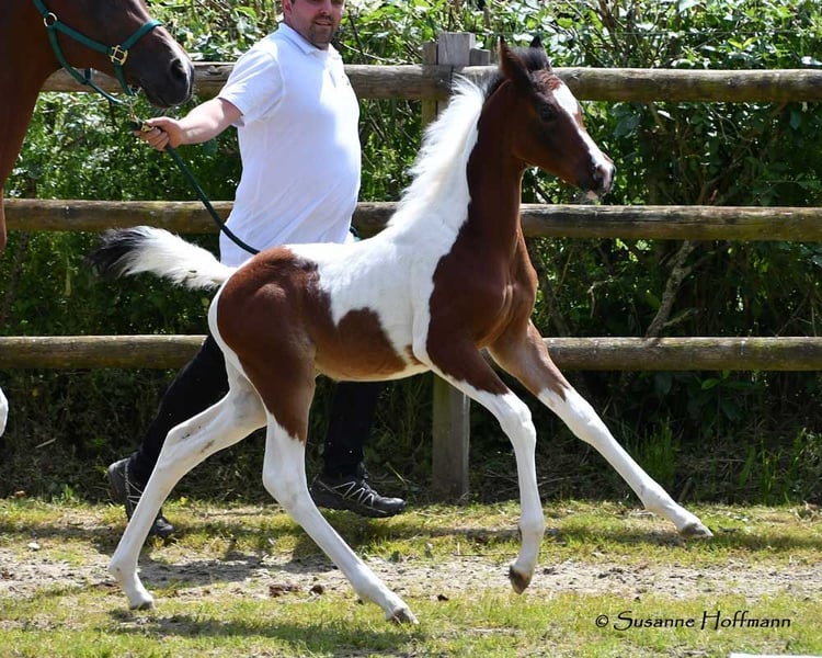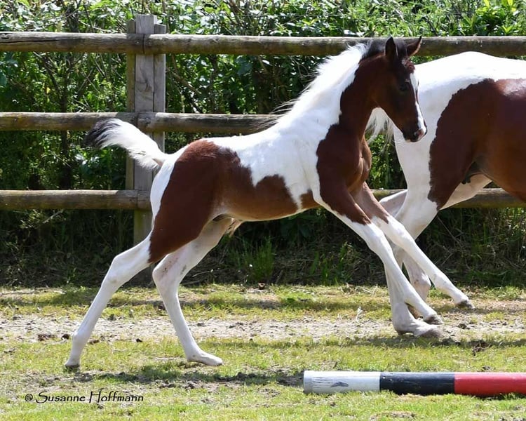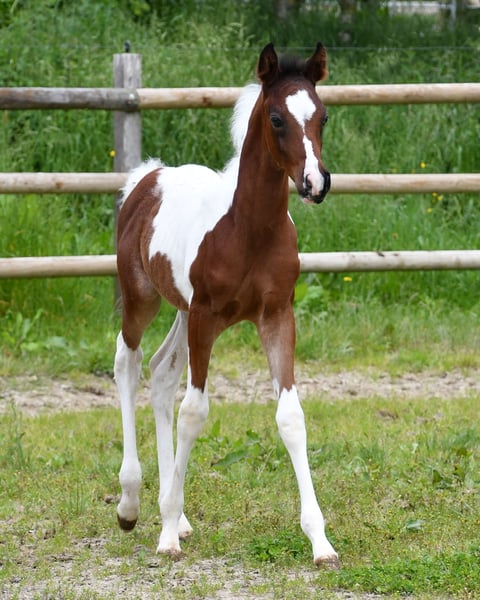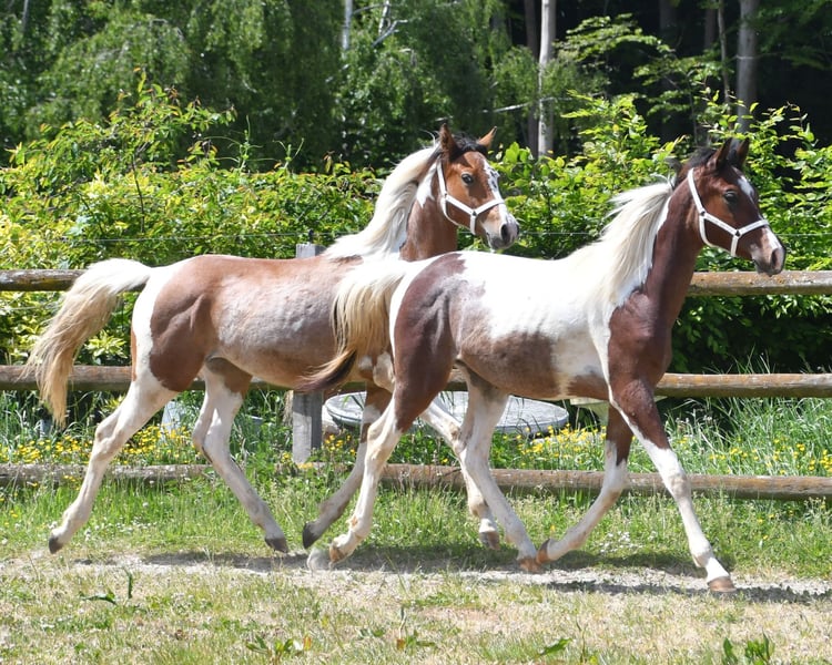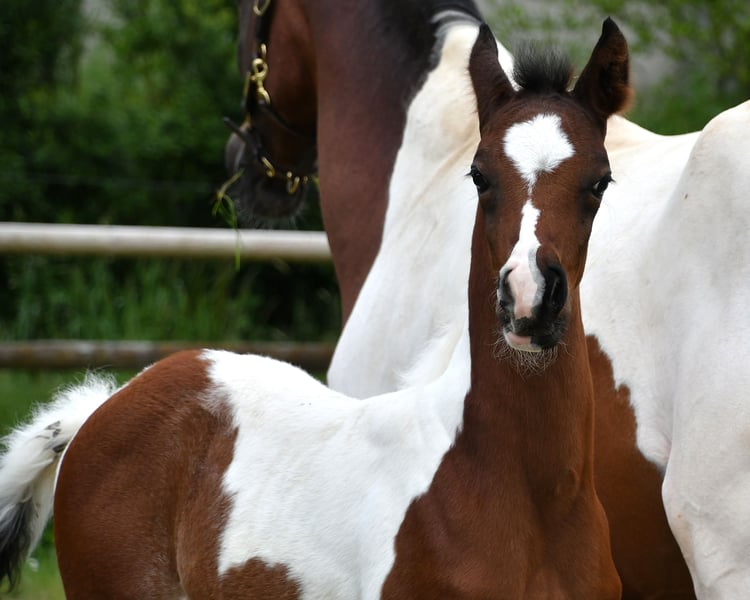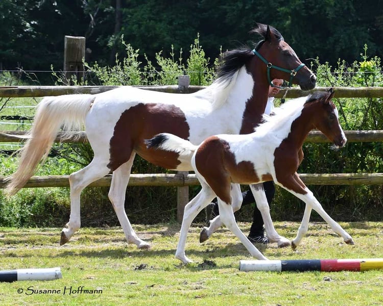 Lysanto is a very handsome young Pintabian stallion who was awarded a prize as a foal. He knows the foal ABC, i.e. the daily handling, leading, tying up and of course the blacksmith. He is already nice and big, although his mother is also a really big mare. He has great movements, stands correctly on his feet and has beautiful big eyes. His sire Secret Legacy is imported from the USA, licensed in Germany and has passed his stallion performance test as a performance stallion, and he could particularly inspire with his very good character and basic gaits. He can be seen in the last photos. Lysanto's dam is a premium mare and elite mare and has only had award-winning offspring to date. She has outstanding movements and a first-class character. Lysanto has very rideable and performance-oriented horses on both sides of his pedigree and is therefore just as interesting for riders with sporting ambitions as for breeders.