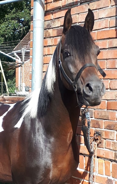 💕 Sweat Dream des Fonds 💕 😍😍😍😍😍😍😍😍😍😍😍 Pintabian stallion 99.7% OX Born 01.04.2020 Heterozygous Tobiano bay Height: 1.53 m (15.3 hh) Sired by HAB Dreamdancer, black and white Tobiano Out of Khadra des Fonds, Vollblutaraber, bay ❤❤❤❤❤❤❤❤❤❤❤ Mr. D is looking for a new challenge. Our beautiful stallion is seeking a place where he can be pampered and further developed. He needs daily activity, has a lot of energy, and an excellent musculoskeletal system. With such a stallion, you are always the center of attention. He has been ridden in all three gaits and has enjoyed intensive groundwork. He is bred for natural breeding. He is kept in an open stable but is also familiar with a box stall, although he is not happy there.