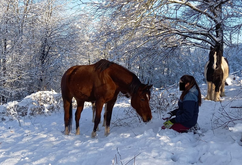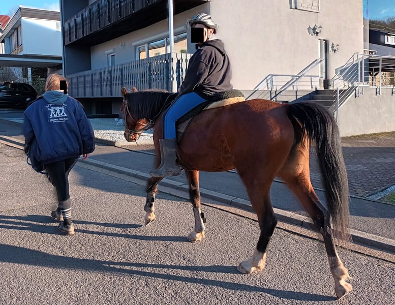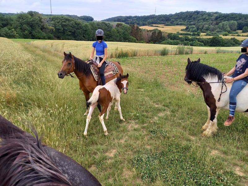 Nele Tanati ist eine nette, unkomplizierte Stute. Sie ist bei mir geboren und kennt nur Offenstallhaltung. In der Herde ist sie im unteren Rangbereich. Ihre Eigenschaften: - Ist lieb und neugierig - Steht brav beim Schmied (zur Zeit barhuf, über Sommer meist vorne beschlagen) - Geht in den Hänger (Wenn sie mal keine Lust hat, dauert es max. 10 Minuten) - Ist im Schritt eher langsam unterwegs - Ist leicht und bequem zu reiten, kennt allerdings (bisher) nur das Gelände - Kann alleine weggehen und auch mal alleine daheim bleiben - Geht nicht so gerne durch Wasser, macht es aber - Mag Hunde nicht besonders gerne, macht ihnen aber auch nichts (wenn sie nicht gerade versuchen, sie in die Fesseln zu knappen…) - Ist eine liebe und fürsorgliche Mutter (Hat bisher 2 prämierte Fohlen, die beim ZFDP eingetragen wurden, 1 x Pinto und 1 x Arab. Partbred Spezial) In 2025 hat sie ersten Tagesritt vorbildlich gemeistert. In der Gruppe von 9 Pferden konnten wir in allen Positionen mitreiten, sie war fleißig und freundlich. Weiteres gerne auf Anfrage.