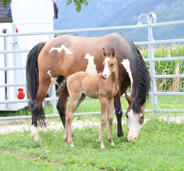 Colorful Bahari – Eine Partbred Araber Stute, die (Zucht)Träume wahr werden lässt Colorful Bahari ist eine Stute, die man nur äußerst selten findet – eine typvolle, ausdrucksstarke und genetisch außergewöhnliche Partbred Araberin, die sowohl optisch als auch züchterisch höchste Ansprüche erfüllt. Hervorragende Abstammung – Elite und Championblut vereint. Mutter: Tochter des außergewöhnlichen Elitehengstes aus Amerika TE Pharenheit, bekannt für Charakter, Präsenz und Leistungsbereitschaft. Vater: Der vielfach ausgezeichnete Multichampion Kunar T, dessen Nachkommen auf Shows und in der Zucht überzeugen. Diese Kombination macht Colorful Bahari zu einer genetischen Schatztruhe für anspruchsvolle Züchter. Ihre Nachzucht zeigt bereits eindrucksvoll, welches Potenzial sie weitergibt. Bewährte Zuchtstute – Mutter außergewöhnlicher Fohlen Colorful Bahari wurde 2015 geboren und hat bislang drei herausragende Fohlen gebracht, die allesamt mit Typ, Farbe und Bewegung sofort beeindrucken. Aktuell steht sie mit Fohlen bei Fuß, was ihre Zuverlässigkeit und gute Fruchtbarkeit nochmals unterstreicht. Exterieur & Auftritt – Schönheit in Bewegung Colorful Bahari vereint Eigenschaften, die in dieser Kombination nur selten anzutreffen sind: eleganter, edler Araber-Typ, korrektes kräftiges Fundament, moderne ansprechende Größe, gangstark mit viel Elastizität und Vorwärtsdrang, starke Präsenz und Ausstrahlung die sofort ins Auge fällt. Sie verfügt über beste Voraussetzungen, um weiterhin hochwertige, typvolle und auffällige Fohlen zu bringen – ideal für ambitionierte Zuchtprogramme. Ein absolutes Highlight ist ihr außergewöhnlich hoher 98,44% Overo-Anteil – eine absolute genetische Rarität im arabischen Partbred-Bereich. Diese Seltenheit macht sie besonders wertvoll für Züchter, die gezielt Farbe mit Qualität und arabischem Typ verbinden möchten. Für Kenner, Liebhaber & Visionäre Colorful Bahari ist die perfekte Wahl für alle, die: eine besonders seltene und genetisch wertvolle Zuchtstute suchen. Typ, Bewegung und Farbe in ihrer Zucht vereinen möchten. Großen Wert auf Elite- und Champion-Abstammung legen. Außergewöhnliche, auffällige Fohlen planen. Eine Stute mit Zukunftspotenzial für anspruchsvolle Zuchtziele möchten Ein Angebot, das man nur einmal findet. Stuten wie Colorful Bahari kommen extrem selten auf den Markt. Ihre Kombination aus Abstammung, Optik, Genetik und verlässlicher Zuchtleistung macht sie zu einer außergewöhnlichen Gelegenheit für Züchter, die ihr Programm auf ein neues Niveau heben möchten. Bahari kann ab mitte/Ende Februar in ihr neues Zuhause umziehen. Bis dahin steht sie natürlich kostenfrei bei mir. Melden, anschauen, sich verlieben...