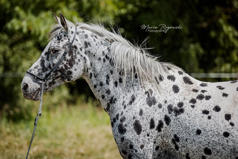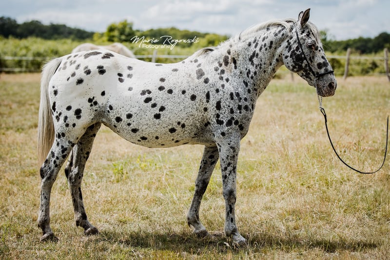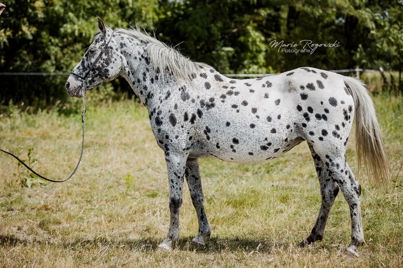 Jument arabesque (ZfdP Spezialpferde) | *2012 | Black Leopard (pie tigrée) | 150 cm ABRAKADABRA GF est une jument arabesque correctement bâtie, au pelage remarquable, à la silhouette athlétique et aux membres solides. Elle n'a jamais été montée et n'est actuellement pas dressée, mais elle est habituée à la vie quotidienne au haras. Ses mouvements sont légers et rythmés. Son père, Attila vom Wethautal, était un étalon primé à l'apparence remarquable, doté d'une très bonne mécanique des antérieurs et d'un caractère charmant. Il a été sacré vainqueur de l'approbation et a réussi le test de performance des étalons malgré une formation tardive. Sa descendance a convaincu à maintes reprises par son type, sa correction et ses allures. La mère Messina ox apporte du sang arabe pur dans la lignée et confère à Abrakadabra une élégance et une expression supplémentaires. Abrakadabra est adapté à l'élevage ou à une future carrière dans les loisirs.