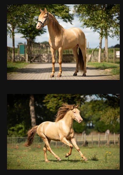 Jungstute zum Verkauf EINZIGE CHANCE!! Klassischer Champagne, dun, silber, Appaloosa mit 50 % OX-Blut. Ist homozygot für Schwarz (EE). ***Steht nur zum Verkauf, weil sie nach dem Verkauf anderer Stutfohlen alleine stehen würde. Der Rest sind Hengste.*** Bessere Fotos/Videos folgen im Frühjahr. https://www.allbreedpedigree.com/sayara+ylluminated+by+syriana Hat einen Pass und Zuchtbuchpapiere, ist aktuell mit Hufschmied, Entwurmung und Impfungen versorgt. Geschätzte Stockmaß ca. 140 cm, D-Pony. Kennt den Hufschmied, Halfter, Spaziergänge im Freien, Putzen. Sehr brav im Umgang, beißt und schlägt nicht. Ist die ranghöchste in der Jahrgangsgruppe hier. Leben 24/7 draußen. Ist kerngesund. Keine Angst vor irgendetwas, neugierig, arbeitswillig. Yana wird eine Bereicherung für die Zucht, aber auch als Sportpony. Ihr Vater misst 1,55 m und vererbt seine kräftige Konstitution an alle Nachkommen. Er ist eine ganz besondere Mischung aus Halb-Araber, 25 % Rocky Mountain und 25 % Paso Fino (Gangpferd). Ihre Mutter ist eine Halb-Araber mit 25 % Welsh-Blut. Soweit mir bekannt ist, ist Yana die EINZIGE Partbred-Araberin in NL mit dieser wunderschönen Farbe! Selbst mit 50 % Araberblut hat sie eine kräftige Konstitution, was ihre vielseitigen Einsatzmöglichkeiten erhöht. Egal, wo sie hinkommt, sie wird alle Blicke auf sich ziehen. Ein wirklich besonderes Pony, bei dem ich auch ernsthaft überlege, ob ich sie abgeben soll. Aber ihr Wohlergehen geht vor, alleine stehen ist keine Option, auch nicht in einer Hengstgruppe. Bei einer guten, seriösen Vermittlung darf sie umziehen, sonst werde ich einen passenden Partner für sie suchen. **Der neue Besitzer erhält einen Gutschein, der Anspruch auf eine Deckung durch einen meiner Hengste nach Wahl gewährt, wenn die Stute 3 Jahre oder älter ist.** Transport zum neuen Besitzer innerhalb von 200 km ist im Kaufpreis inbegriffen. Für weitere Entfernungen ist eine angemessene Zusatzzahlung möglich. Bitte bevorzugt per WhatsApp +31610271771 kontaktieren. EN-DE-NL Anonyme, zufällige Anfragen hier werden nicht beantwortet. Ihr Vorname und Ihre Telefonnummer werden geschätzt.