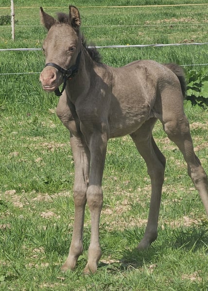 Yearling mare available. UNIQUE OPPORTUNITY!! Classic champagne, dun, silver, Appaloosa with 50% OX bloodlines. Homozygous for black (EE). ***Only for sale because she would otherwise be alone after the sale of other filly mares. The rest are stallions.*** Better photos/videos will follow in spring. https://www.allbreedpedigree.com/sayara+ylluminated+by+syriana She has a passport and breeding papers, is up to date with farrier, deworming, and vaccinations. Expected height around 140 cm, D pony. Knows the farrier, halter, outdoor walks, grooming. Very well-behaved, does not kick or bite. She is the highest-ranking in her yearling group here. Lives outside 24/7. In excellent health. Completely fearless, curious, and willing to work. Yana will be an asset for breeding, but also as a sport pony. Her father measures 155 cm and passes on his strong build to all his offspring. He is a very special mix of half Arab, 25% Rocky Mountain, and 25% Paso Fino (gaited horse). Her mother is a half Arab with 25% Welsh blood. As far as I know, Yana is the ONLY part-bred Arab in the Netherlands with this stunning color! Even with 50% Arab blood, she has a sturdy build, offering versatile uses. Wherever she goes, she will be a head-turner. Truly a special pony, and I seriously hesitate to sell her. But her best interests come first; being alone is not an option, nor in a stallion group. With a good, serious match, she may move; otherwise, I will find her a companion. **New owner will receive a voucher entitling her to a covering by one of my stallions of choice once she is 3 years or older.** Transport to the new owner within 200 km included in the purchase price. For greater distances, a reasonable contribution applies. Please preferably contact via WhatsApp +31610271771. EN-DE-NL Anonymous, random questions here will not be answered. Your first name and phone number are appreciated.