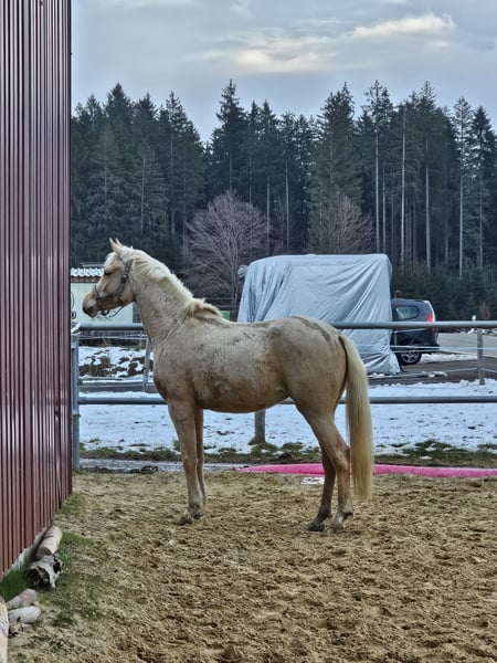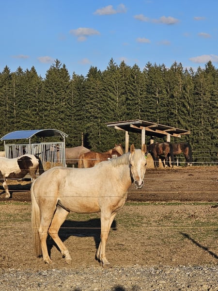 Wegen Aufgabe der Pferdehaltung ist diese bildschöne Jungstute abzugeben Palomino geb. 2023, Stm. z.Zt. 150 cm sehr lieb, sehr menschenbezogen, ruhig und ausgeglichen, nervenstark, ist noch roh, beherrscht natürlich das Fohlen-ABC, ist im Offenstall aufgewachsen hat leider ein Sommerekzem bei Fragen gerne melden