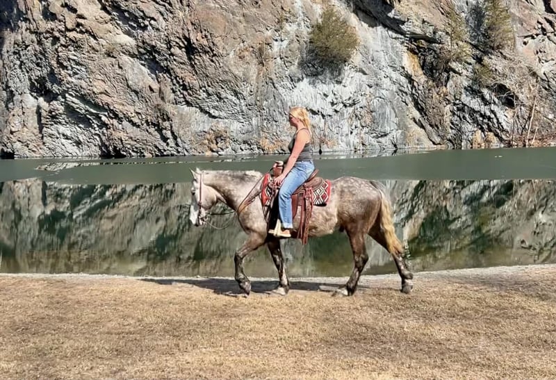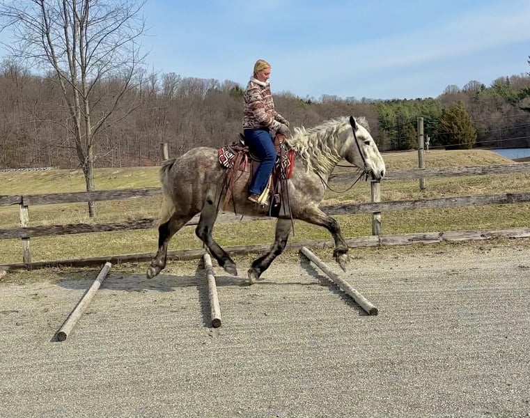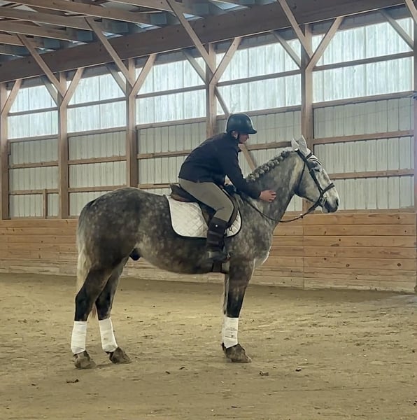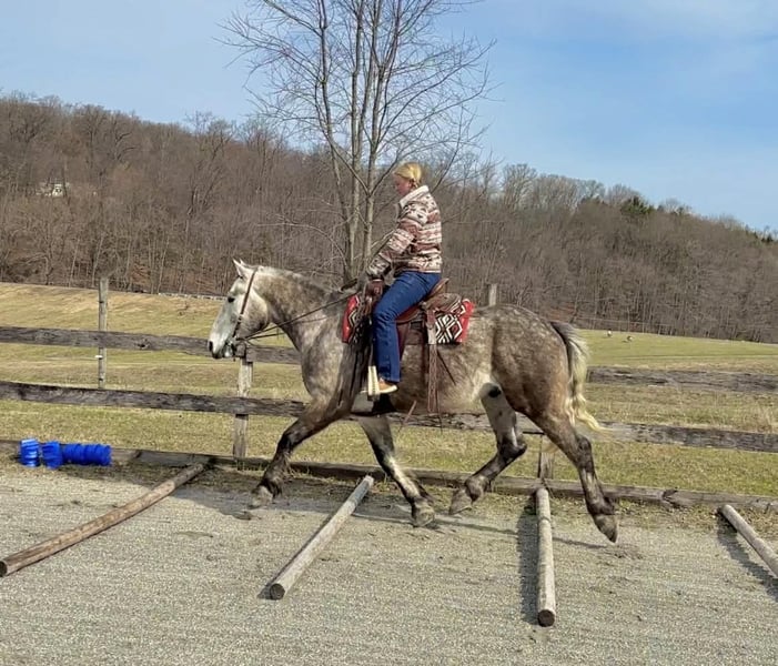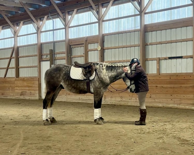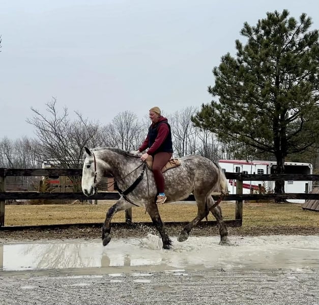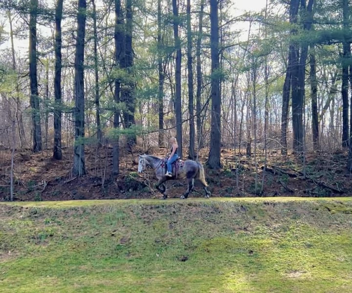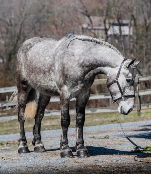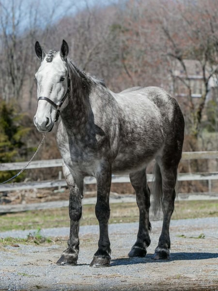 🌟𝑨𝒑𝒓𝒊𝒍 𝐀𝐋𝐋 𝐒𝐓𝐀𝐑 𝐋𝐈𝐍𝐄𝐔𝐏🌟 Happening now thru MONDAY | APRIL 6th - Available EXCLUSIVELY on HorseBid's website! For more details and to register visit: www.Horsebid.com CONSIGNOR CONTACT: Triple R Horses 610-806-2613 LOCATION: New Holland, PA BREED: Percheron/Friesian REGISTERED: No REGISTERED NAME: Sebastian COLOR: Dappled Grey HEIGHT: 16 AGE: 4 GENDER: Gelding “Sebastian” is a 4yr old, 16hh, Percheron/Friesian cross gelding, with the sweetest personality, and a face that you simply can not resist! Don’t let his age deter you, Sebastian is an old soul, who longs for love and loves his people. If you are looking for safe, reliable, fun, and an ultimate all arounder, here is your boy!!!! This boy is sturdy and compact, yet not a monster in height, making him very versatile and friendly for smaller set ups. Sebastian is an amazing trail partner, and would make a great husband horse! This boy rides and drives, and he is a certified sweetie pie. In the barn, Sebastian has zero bad habits. He never complains and doesn’t mind if he is alone or has buddies. He can live in, or out, gets along super well with others and is gentle in a mixed herd. If you are present in the pasture, he will find you and come ask for attention. He stands on the cross ties to be groomed, braided, tacked, etc. He has zero bad habits or stall vices and is as quiet as a mouse in his stall. Sebastian has good ground manners and is safe for beginners, and kids to work around. He is safe with my pups running all around him, and doesn’t mind commotion in the barn. Sebastian is an amazing trail partner. He is quiet, easy going, and brave. He is the perfect mixture of laid back and adventurous. He will walk around all day long on the buckle and follow the group, or take the lead and go off grid pushing through the woods. Sebastian crosses water, logs, bridges, rocks, and is safe with traffic, machinery, bikes, dogs, you name it. He is happy to stop and let hikers pet him. He will ride in the lead, middle, back, and is willing to leave the group and go off on his own, with that, he definitely has the mentality to be a great fox hunter. Drop your reins and enjoy the ride, he will mosey right along. But he is not a dead head and pays attention to his footing, he knows to shift his weight going downhill, takes care of his rider on narrow cliff sides, and is willing and happy to move out asked. You can trot or canter then ask him to come right back down to an easy walk. He would make an awesome mount for someone who is looking for a camping partner, mountain horse, or hunting. He is patient and happy to stop and stand when you ask. On one trail ride, we came across mountain climbers, he didn’t bat an eye at them up above his head, instead he looked up, and watched them, almost in awe. Sebastian ties to the trailer quietly while getting ready, and he is the same horse in new places. This boy is very reliable and the same horse every ride. He loads and trailers well, and fits right into my normal size horse trailer. He is the type of horse that you can throw your husband on and pack his saddle bags full of beer. Go and enjoy the ride! Sebastian rides western, english, bareback and in a plain snaffle. He has very comfortable gaits, and listens great to voice commands. He has a smooth, lofty, canter, in fact one of the most comfortable canters I have ridden on a draft cross. Give a kiss and he will pop right into a lovely canter with smooth transitions. You can adjust his trot from slowwww and pokey to, a more extended trot. He is the perfect combo of whoa and go, he is happy to be lazy and slow yet you don’t need a crop or spurs to ask him to go to work. He is light in your hands and learning to move off of leg. Say “whoa” and he will stop. Sebastian is extremely smart and enjoys learning. He is always happy and doesn’t get upset with his rider. He is the same horse every ride and does not need to be in a routine. Climb on and go have fun. In the ring Sebastian will walk, jog, trot, canter and is learning his leads nicely. He naturally picks up the correct leads every time. While he is still considered green in the arena due to most of his time being spent hacking or trail riding, he is extremely willing, and loves to please his person. He enjoys ring work and learning. This guy has such an amazing brain already, and he is only going to get better. Sebastian has had a light and easy start to life and he takes everything in stride as if he’s done it before. He has not been pushed, and has been worked appropriately for his age. I have not pushed for collection, he is naturally soft in your hands. The videos you see of him trotting ground poles, that was the first time I asked him, you can see him use his brain and figure it out. While drafty, Sebastian is agile and light on his feet. He is not a clumsy, pluggy, no thoughts type of horse. Due to his age, he has only been introduced to jumping recently and has not jumped a lot. The jumping footage you see in his full video is the first time that I asked him to jump, steady and honest he was to every fence. He could easily make an amazing fox hunter. I could also see him dabbling in low level dressage or eventing. This boy is currently set up to head in absolutely any direction. His calm demeanor and people person attitude shows that he could even be a therapy horse. Sebastian is broke to drive single and double. He is quiet and easy under harness. He is patient and will stand around all day. I could see him being a wedding horse, with his beautiful grey color and quiet attitude. I haven’t driven a horse in about a year and a half. I was nervous and of course, I picked the cold day with 30mph winds. However, Sebastian gave me my confidence back. He was patient with me, and did everything I asked. He is not a fast horse under harness, he is slow and easy going, a Sunday stroll type of guy. He listens to all of