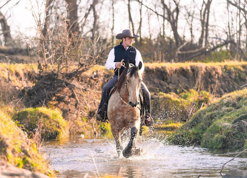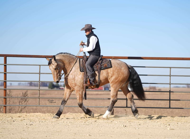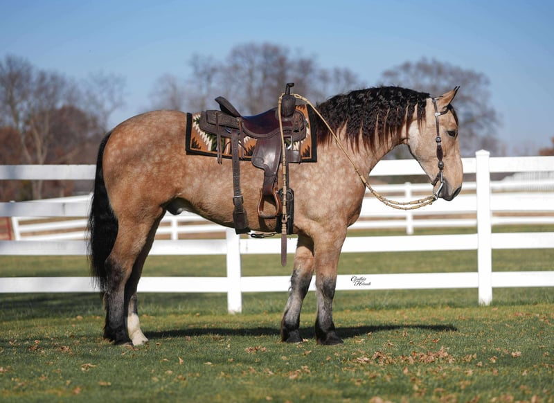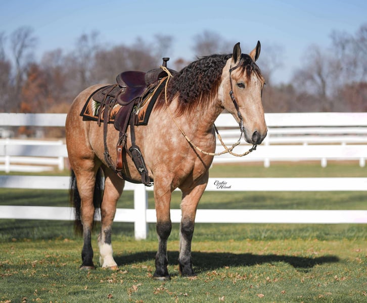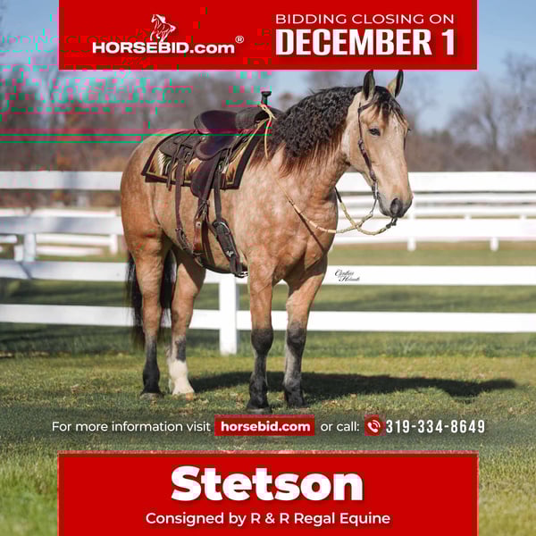⚜️ 𝓽𝓱𝓮 𝐇𝐨𝐫𝐬𝐞𝐦𝐚𝐧'𝐬 𝓢𝓱𝓸𝔀𝓬𝓪𝓼𝓮⚜️ Happening now thru MONDAY | DECEMBER 1st - Available EXCLUSIVELY on HorseBid's website! For more details and to register visit: www.Horsebid.com CONSIGNOR CONTACT: R & R Regal Equine 319-334-8649 LOCATION: Independence Iowa BREED: Percheron quarter horse cross REGISTERED: No REGISTERED NAME: Stetson COLOR: Buckskin HEIGHT: 15.3 AGE: 4 GENDER: Gelding Stetson – 4-Year-Old Buckskin Crossbred Gelding, 15.3 Hands Stetson is a talented and versatile 4-year-old buckskin crossbred gelding standing 15.3 hands. He is well-trained under saddle and in harness, making him a true all-around horse. In the arena, he performs confidently and willingly, showing good manners and responsiveness. On the trails, he is calm, sensible, and sure-footed, handling varied terrain and unexpected obstacles with ease. Stetson is also experienced in traffic and remains steady and reliable around cars, trucks, and other distractions. He has extensive driving experience, including being part of a 6-horse hitch, demonstrating his ability to work as part of a team and follow commands accurately. With his friendly disposition, solid training, and versatility, Stetson is a fantastic choice for riders and drivers of all levels looking for a dependable horse who excels in multiple disciplines. Whether you’re looking for a confident trail companion, a reliable arena partner, or a trained driving horse, Stetson has the skills, temperament, and experience to fit the bill.