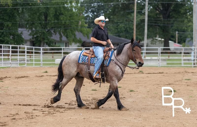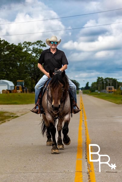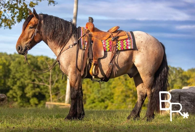 ONLINE AUCTION Place your bids at www.PlatinumEquineAuction.com Starting Bid $3500 Auction ends October 27th, 2024 Need a new saddle? Check out White Rock Saddles on our website or Facebook! Everyone meet Ernie….This absolutely stunning unicorn is what dreams are made of! He is a bay roan Percheron/QH cross standing 15 hands tall and 4 years of age. This is one of the kindest and safest horses to ever come through our program. I truly believe anyone who wants to ride, can ride this horse. He has three soft and easy gaits that are very smooth to ride. Does all of the obstacles out on the trail. Does it all in stride and with ease . Nothing bothers this horse he will go and do anything with no fuss. Has been used at local rodeos to carry the flag at opening ceremony. Also as a pickup horse for youth rodeo. Ernie has been to the little town of Mt. Grove Missouri on his days off. Where he is seeing all the sites around town and entertaining families for pics and rides. He is truly a kind hearted unicorn. We have started him over fences which he enjoys. Please watch our must see video. .You will be entertained for sure.Ernie is totally UTD on farrier,dental,vetting and has all vaccines and necessary paperwork ready to go. Has a clean vet inspection from our licensed veterinarian. We have professional shipper’s that we use. That can haul horses nationwide. Ernie is located in Mountain Grove, MO. We encourage customers to come out and try our horses. Call for more information Beaver Ranch Mike 410-490-7384. ONLINE AUCTION Place your bids at www.PlatinumEquineAuction.com Starting Bid $3500 Auction ends October 27th, 2024 Need a new saddle? Check out White Rock Saddles on our website or Facebook!