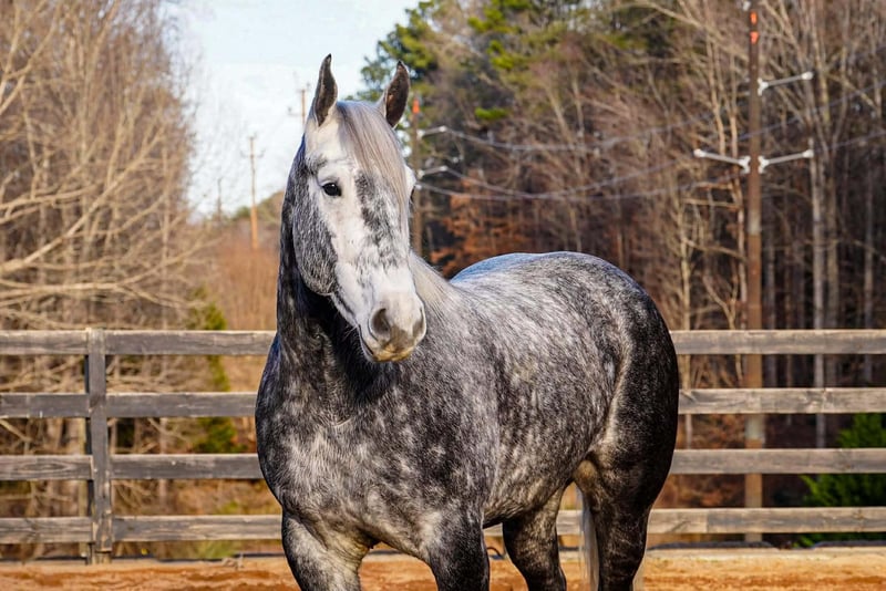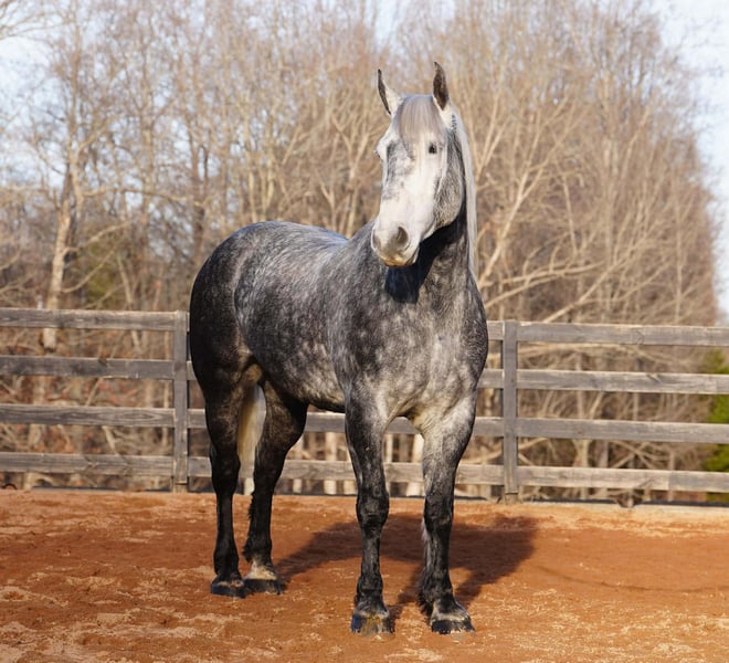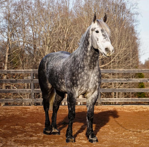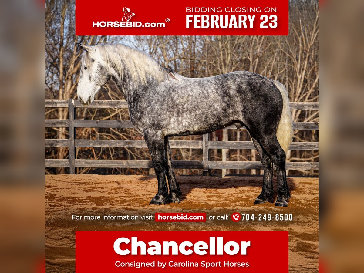 💎 𝐓𝐇𝐄 𝓓𝓲𝓪𝓶𝓸𝓷𝓭 𝐒𝐇𝐎𝐖𝐂𝐀𝐒𝐄 💎 Happening now thru MONDAY | FEBRUARY 23rd - Available EXCLUSIVELY on HorseBid's website! For more details and to register visit: www.Horsebid.com CONSIGNOR CONTACT: Carolina Sport Horses 704-249-8500 LOCATION: Clover, SC BREED: Percheron x Friesian REGISTERED: No REGISTERED NAME: Chancellor COLOR: Dapple Gray HEIGHT: 16.3 AGE: 6 GENDER: Gelding Chancellor is a 6 year old Percheron x Friesian gelding standing 16.3 hands high. Chancellor is the epitome of luxury and class! He is an absolute gem in every way, and a very rare find. You will stand out in any place with this horse! He is a jack of all trades with looks, brains, incredible presence, and a canter like no other! When this horse comes in the ring he outshines everyone else, every time. Whether you want to bring home top ribbons in the dressage ring, or have the most show stopping horse on the trail, you will have a reliable and smart partner to do any job with. In the ring, Chancellor rides English & Western. Under saddle, he is uncomplicated and reliable. You’d think he was an imported warmblood with the canter this horse has. He will pick himself up, collect and ride with contact in the bridle, and naturally carries himself correct on a loose rein. He has clean, easy canter departures and transitions, is soft in the bridle, works well off your leg and seat, knows basic lateral work, and will move out or collect when asked. Put together a dressage test, practice working equitation type of drills, or just enjoy a well rounded and naturally talented horse on a hack around the barn. On the trails, Chancellor is reliable and brave. He is the center of attention out on hunter paces, and he knows he’s handsome because he really does pose for the camera! Chancellor crosses water, is traffic safe, and is sure footed on any terrain. We have taken Chancellor off property to lots of new places. He’s a blast on the cross country field, and super smart with his feet on the obstacle course. In the barn, Chancellor is sweet and loves to be your buddy. He’s the first to the gate in the pasture, and follows us around while we do the barn chores. He is a gentleman to groom and tack, and absolutely loves attention! He is an easy keeper that’s happy living out - but is a good boy when stalled as well. He requires no maintenance and has no vices. Chancellor is the type of horse you look forward to riding every day. After a long stressful day, I look forward to taking him out to the field and cantering around. He is extremely intelligent, very easy to work with, and honest as the day is long. He shows a lot of promise in many different disciplines, and could go on to be successful in dressage or western dressage, working equitation, and eventing. Though he is just as happy and safe to be a husband horse or trail partner. Full clean vetting on file. Chancellor is available to be seen at our farm in Clover, SC by appointment. Interested in bringing Admiral home? Give us a call today! Please take the time to read our Buyers Guide to answer any questions or concerns you may have. Contact Caleb 704.249.8500