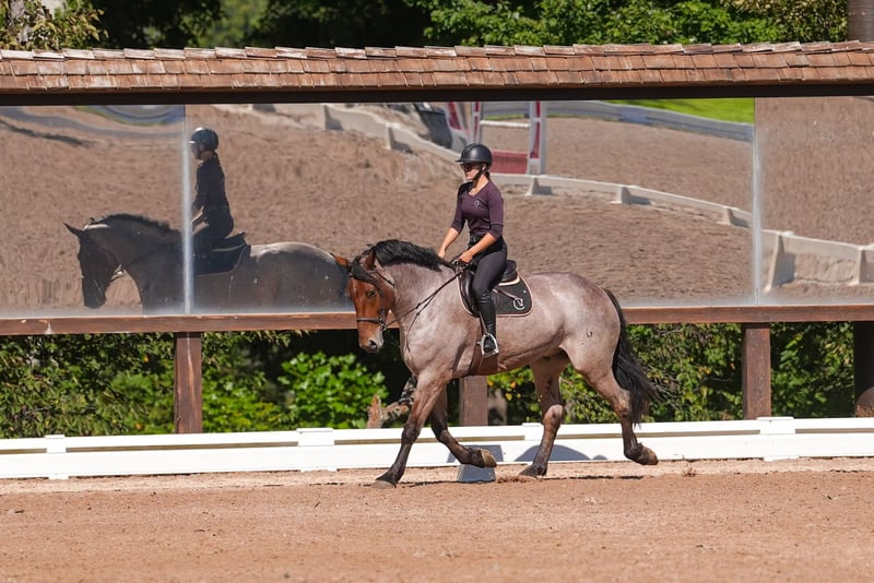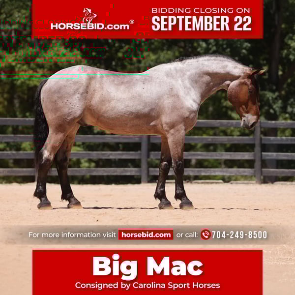 🍁𝒕𝒉𝒆 𝐅𝐀𝐋𝐋 𝑺𝒑𝒆𝒄𝒕𝒂𝒄𝒖𝒍𝒂𝒓🍁 Happening now thru MONDAY | SEPTEMBER 22nd - Available EXCLUSIVELY on HorseBid's website! For more details and to register visit: www.Horsebid.com CONSIGNOR CONTACT: Carolina Sport Horses 704-249-8500 LOCATION: Clover, SC BREED: Percheron x QH REGISTERED: No COLOR: Bay Roan HEIGHT: 17.1 AGE: 5 GENDER: Gelding Big Mac is a 5 year old Percheron x QH gelding standing 17.1 hands high. This is a classy, well broke, and smart horse that is wise beyond his years. Riding him, you would think he was 15. We can not express enough how great he has been for the smaller kids as a confidence builder. Once they were able to feel safe on such a big guy it has unlocked all the horses in the barn for them. He simply makes Horse Riding FUN. He knows every move, yet is equally safe enough for the children to take lessons and play around with. Mac is a jack of all trades, and a reliable parter on any adventure. He has won every trail challenge he's been to so far, he is just so much fun to put through the obstacles! He sees new things and continues to do his job like he's seen it all before. He is also broke to drive! We have taken him to eventing and working equitation clinics and events with both a professional, and kids, the saddle and he has never put a foot wrong, only impressing us more and more every time he goes out. He is the type of horse that is equal parts beauty and brains. He will just as easily be a show horse as he will be a husband or guest horse on the trails. He's happy doing any job as long as he gets lots of love from his rider afterward. Mac is a kind and willing horse that genuinely enjoys human partnership. The best thing about a horse like Mac, is that when they are born naturally this safe and quiet, with the phenomenal start he has had, he will just age like a fine wine! In the ring, Mac can do it all! Bareback and bridleless, English, western, and dressage, even go around with the kids in their lessons. He will ride in a frame or on the buckle, and is soft in the bridle. Mac has a good neck rein, stop, and will pivot, side pass, shoulder/haunches in. We have introduced him to various small jumps on the cross country field. At his age we don't do much jumping, but we do bring them around to pop over all of the small fences to be sure they will be brave and honest. He absolutely has the scope and bravery for it when he is ready! He jumped around with no cares in the world, cantered through the water, and stepped over ditches like he's seen it a million times before. With the children, he is kind and forgiving. He will walk, trot, and canter smoothly and slowly, even with the most timid of riders. He is truly wise beyond his years and intuitive to what his rider needs from him. On the trails and off property, Mac is safe for any rider. Throw the husband, the kids, or your non-horsey friend on him and know they will be safe and have a great ride. You can go for a hack with the girls after a long day at work, or load him up and take him on a weekend camping trip through rough, rocky terrain, and have the perfect horse for both jobs. He swims, crosses streams, tackles steep hills, and is sure footed across any obstacle. He is safe in traffic, and has been driven, and ridden down busy roadways. Mac is used to going off property weekly for various schooling trips, clinics, and trail rides. He is easy to load, and a very god boy on and tied to the trailer. He requires no prep, just load up and go! In the barn, Mac loves his people! He is polite with wonderful ground manners, and is so kind and sweet to be around. He is happy living inside or out, and currently lives out in a mixed herd. Mac loves to be groomed, braided, and doted on. He is used to kids, dogs, goats, and more running around the barn, and it doesn't phase him one bit. Big Mac is an easy keeper with no maintenance or quirks. Recent clean vetting on file. Big Mac is available to be seen at our farm in Clover, SC by appointment.