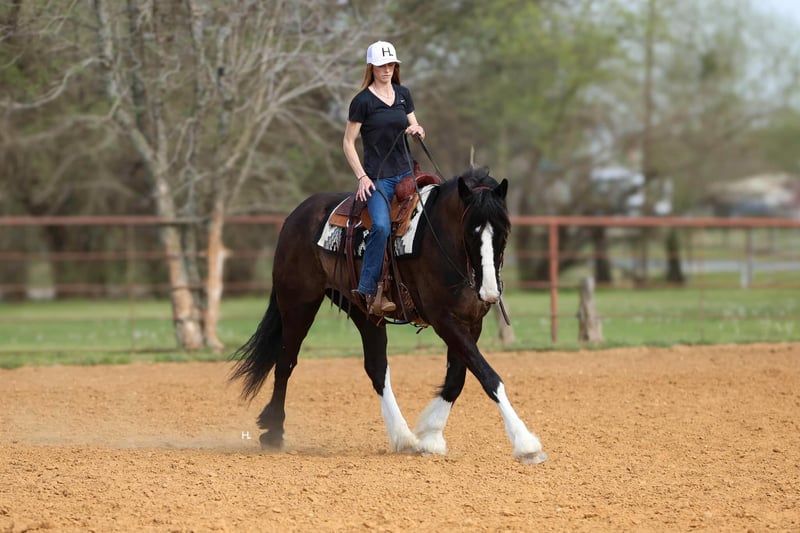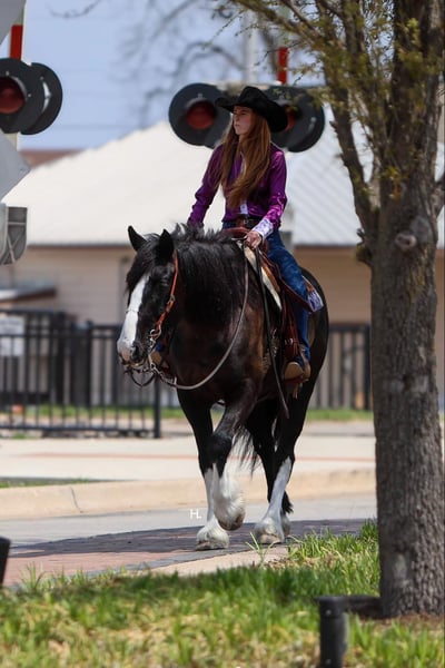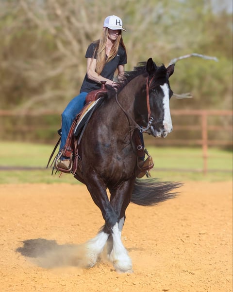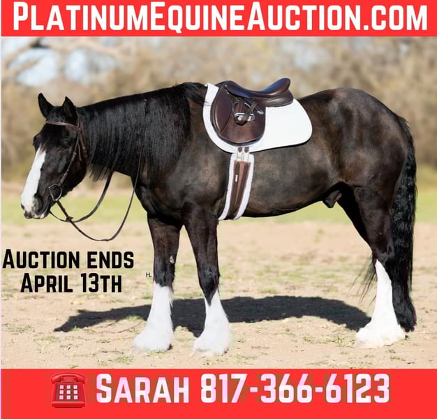 ONLINE AUCTION Place your bids at www.PlatinumEquineAuction.com Starting Bid $3500 Auction ends April 13th, 2025 Need a new saddle? Check out White Rock Saddles on our website or Facebook! Leroy is what every draft cross lovers dreams are made of. This 8yr old, 16hh, 1350lbs, Quarter Horse/Draftcross Gelding that has the puppy dog demeanor of a draft that everyone adores along with the rock solid conformation but has the ability and versatility to perform like a quarter horse half his size if needed and has the resume to prove it. Dad can use him to do ranch work, mom can ride him out on the trails or take him over fences, and the kids can play around him safely and dote on him to their hearts content. Leroy is truly a horse the whole family can and will enjoy. Leroy was bred and raised in Canada and then used to do ranch work in Canada, Montana, and here in Texas. He’s has a great work ethic and there’s no job too big for him. From doctoring in the pasture to dragging calves to the branding fire, Leroy has done it all and is ready for any job you need him to do. With his ranch work history especially in the mountains, it’s no surprise that Leroy is one of the most surefooted horses to grace our program. From mountainous terrain to the plains, he will safely get you to do your destination every time. Leroy crosses creeks and bridges with ease, navigates through thick brush safely, is careful and strategic about his foot placement when going up and down steep terrain, has no qualms when it comes to vehicle or pedestrian traffic, and if you’re on a State Trail way you’re sure to get compliments on him from passerby’s. In the arena, Leroy shines just as bright. Whether you’re riding him under english tack or western, Leroy is a smooth and fancy ride that attracts attention. He is one handed broke, side passes both directions, picks up the correct leads, can turn around slow and correct, and is tuned in to not only your seat, legs, and hands, but your voice as well. A simple sit on your pockets with a bump of the reins and an “easy” can have him going around at a pace slower than some pleasure horses and a bump with the magic “whoah” will have him stopping on a dime. Leroy is comfortable to ride in all gaits thanks to his natural cadence accentuated by his training. He has a lovely ground covering walk, a fantastic jog that can be bumped up to a comfortable working trot, as well as a lope that makes 90% of other horses his size 100% jealous. We truly don’t believe there is anything Leroy can’t do as he’s exceeded every expectation while in our program. He will carry a flag, has been schooled successfully up to 3’6” in both show jumping and cross country with a few prelim and intermediates thrown in, goes around lovely on the flat under english tack, happily keeps a toddler safe while riding double with a parent as well stepping up to the plate to be a huge blank canvas for said toddler’s finger painting. Leroy isn’t just a ranch horse, he’s a horse the whole family can enjoy doing so many different things with thanks to his mind and versatility. When it comes to Leroy’s daily care and handling, he is an absolute gentleman. Leroy has been easy to catch each time we walk out to get him and can typically be heard before seen with his greeting nicker. From grooming to tacking up, Leroy will remain like a patient statue (bonus points, you don’t need any specialty draft tack for him). He’ll let you take your time mounting and unmounting, and you can also safely use a mounting block if needed. Leroy is good to bathe and clip as well. The first time your farrier lays eyes on Leroy he might not be your biggest fan, but after working on Leroy, whether it’s just a trim or a full set, your farrier is sure to like him too. If you’re often trailering to different places, you can rest easy knowing Leroy will always load into your trailer and hauls without any fuss. Leroy has had no previous health or lameness issues, requires no special care or maintenance, is UTD on all routine care, and is ready to become the horse you’ve always wanted to own. We invite you to come meet this exceptional gelding at our place in Weatherford, TX. PPEs welcomed and we can help assist setting up hauling to wherever you call home. For any questions and to talk about if Leroy is the right fit for you, feel reach to out to H Spur Performance & Versatility Horses Sarah at 817-366-6123. To see his other 20+ videos and additional pictures, please visit his page on our website www.hspurhorses.com/leroy. ONLINE AUCTION Place your bids at www.PlatinumEquineAuction.com Starting Bid $3500 Auction ends April 13th, 2025 Need a new saddle? Check out White Rock Saddles on our website or Facebook!