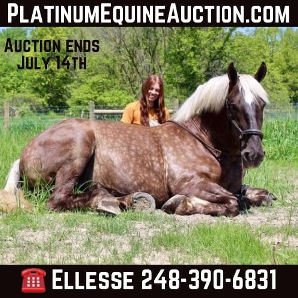 ONLINE AUCTION Place your bids at www.PlatinumEquineAuction.com Starting Bid $3500 Auction ends July 14th, 2024 Need a new saddle? Check out White Rock Saddles on our website or Facebook! If a horse could walk out of a fairy tale into your barn this would be her. She is every bit as magical in person. I’m proud to introduce you to Birdie. This draftcross girl stands 16.3 at 4 years old. She has a beautiful blonde mane and flowing tail which compliment her silver dappled coat. Birdie has excellent conformation. She is well muscled with great bone structure and solid hooves. She is so stunning you could sit and look at her all day! Birdie has the most enthusiastic personality you will find in a horse. She is ALWAYS willing to please. She has a lot of liberty training. Birdie knows how to sit, lay down, and say yes and no. Under-saddle this girl is just about effortless to ride. She has quiet walk, a beautiful trot and the best canter you will sit on. She comes equipped with amazing transitions, both upward and downward, and her brakes are good. She carries herself with a great deal of cadence and class. She has been trail and road ridden, and she will go any where you ask with no silly business. Good luck spooking her! She’s as cool as they come in just about any situation. In addition to her liberty work, Birdie has some very cool buttons. She can canter from a halt, leg yield, side pass, back up, move on and off of seat and leg pressure. Birdie has been playing around with 1st level dressage movements, such as shoulder in, haunches in, extension and collection in all of her gaits. Birdie has been very lightly started over fences. She has been on several hunter paces and has spent many hours out on the trails! This is the most beautiful girl in town. Please call or text Ellesse Schwartz at 248-390-6831 for more information. Birdie lives in Howell, MI 48855. ONLINE AUCTION Place your bids at www.PlatinumEquineAuction.com Starting Bid $3500 Auction ends July 14th, 2024 Need a new saddle? Check out White Rock Saddles on our website or Facebook!