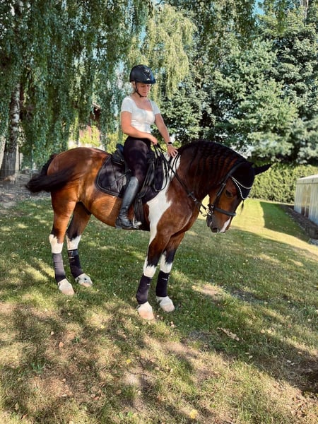 For sale is an impressive Polish Warmblood - gelding. This charming pinto not only captivates with his elegant appearance but also with his pleasant size, standing at 160cm. Kilf is familiar with both open stabling and box stalls. He goes out into the field both in a group and alone. He is excellent for leisure riding and is accustomed to trail rides and the arena. Klif requires an experienced rider who can ride independently of the reins. He is ambitious and wants to be worked with. If you are looking for a loyal leisure partner who will stand by you through thick and thin, then Klif could be the perfect match for you. If you are interested, we look forward to hearing from you.