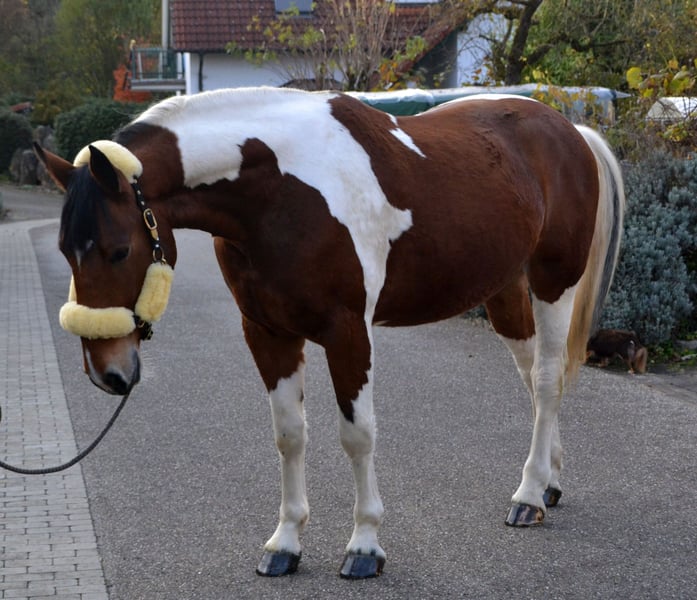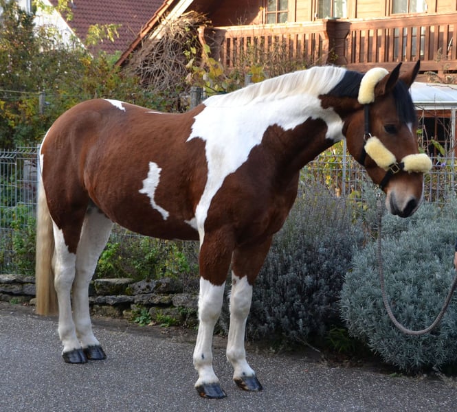 Pegasus, toller im modernen ,schweren Warmbluttyp stehender Pinto Wallach. Bisher wurde Pegasus dem Alter entsprechend schonend angeritten und macht seinen Job dabei ausgezeichnet. Immer sehr brav und ausgeglichen im Umgang und beim Reiten. Lässt sich überall anfassen , putzen , führen , satteln , verladen und ist schmiedefromm. Ein Pferd welches Ruhe ausstrahlt und dem Menschen vertraut. Wurde auch schon in der Gruppe ins Gelände geritten , kennt Reithalle sowie Außenplatz. Sein schönes Gebäude vereint mit toller Farbgebung und weichen Gängen machen ihn zu einem besonderen Allrounder für den Freizeitbereich. Kennt Offenstall sowie Herdenhaltung, ist mit landwirtschaftlichen Tieren und Geräten vertraut. Auf Wunsch mit AKU von anerkannter Pferdefachklinik !