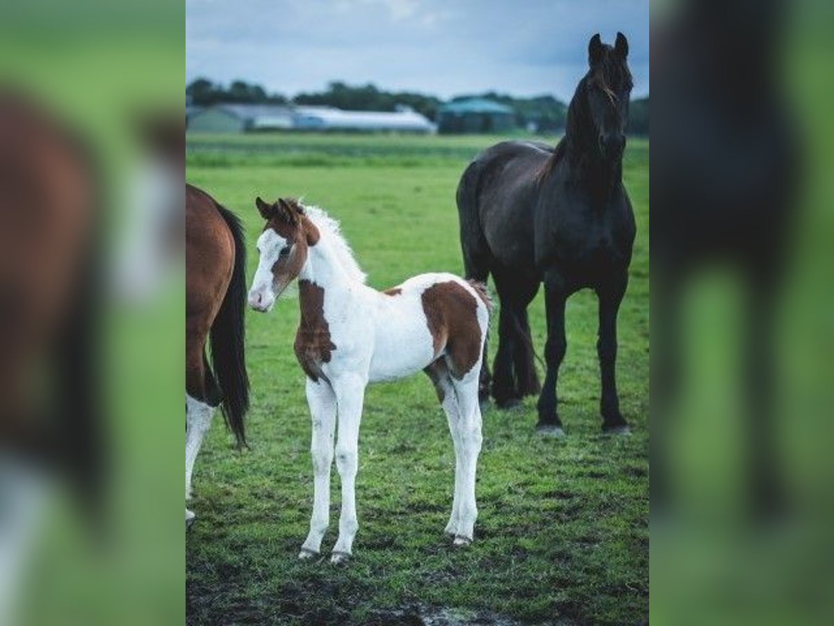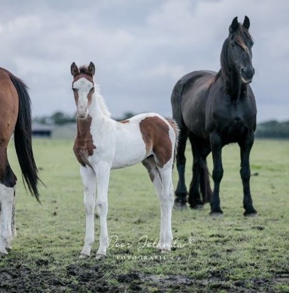 Beautiful brown pinto Baroque Pinto colt, healthy and socially raised in the herd with many other foals as playmates. Mother is a sweet pinto mare of approx. 1.55m tall, father is on the last photos and is a sweet black pinto Baroque Pinto stallion of approx. 1.63m. Beautiful colt with beautiful gaits. He was born in June and can therefore be weaned. He knows the most important thing in horse life: the herd ABC. We can be found with our horses every day but do not train the horses, so all our horses are still completely green. The big advantage is that the horses are well socialized in the herd, have not had any bad experiences and you can teach them everything the way you want it. Every year we have approximately 40 wonderfully beautiful baroque pinto and Friesian foals for sale from our beautiful family stud farm in the Netherlands. And also older horses (0-13 years), all still green and untrained. Stallions and mares. With us you will definitely find your dream horse because we always have a lot of choice. Our horses grow up very naturally in large herds and are therefore very well socialized. Here they lead a dream horse life: in spring and summer in large meadows. In winter in large group stables. Our horses are characterized by a good character, relaxed, cool, strong and sweet and a healthy upbringing. You will find us near Leeuwarden (Friesland, Netherlands) and we would be happy to meet you. Contact: please call or via Whatsapp!