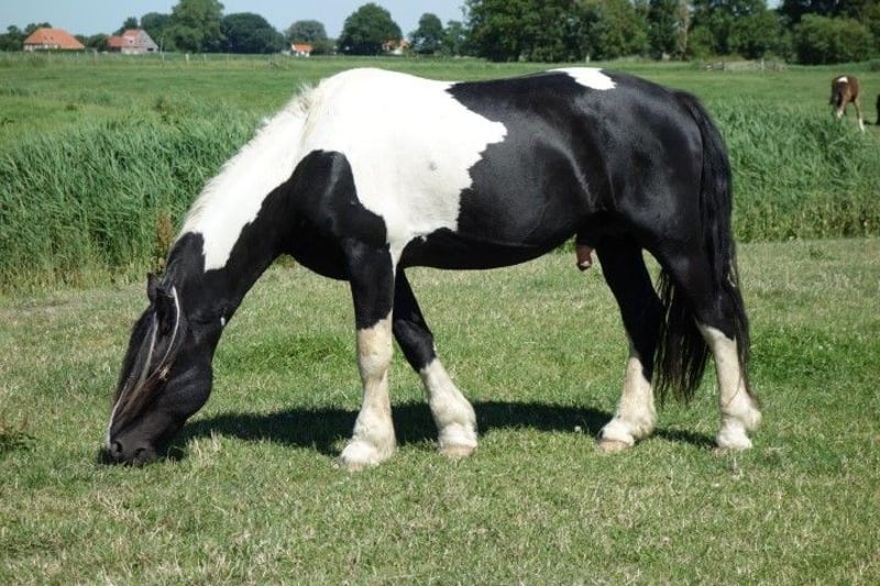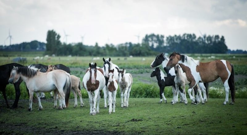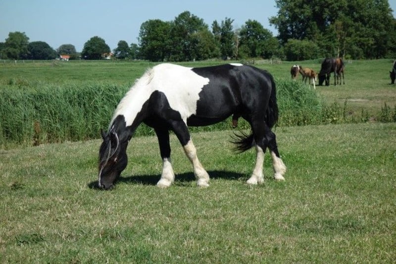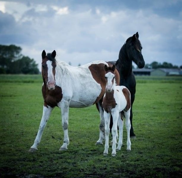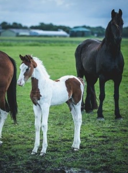 Hermoso potro Pinto Barroco con marcas de color marrón, que creció sano y social en el rebaño con muchos otros potros como compañeros de juego. La madre es una dulce yegua Pinto con una alzada de aprox. 1,55 m, el padre se puede ver en las ultimas fotos y es un dulce semental Pinto Barroco blanco y negro con una alzada de aprox. 1,63 m. Hermoso potro con buena rectitud y bonitos aires. Nació en junio y por lo tanto puede ser destetado. Conoce lo más importante en la vida del caballo: el ABC de la manada. Se nos puede encontrar con nuestros caballos todos los días, pero no los entrenamos, por lo que todos nuestros caballos son todavía completamente verdes. La gran ventaja es que los caballos de la manada están bien socializados, no han tenido malas experiencias y se les puede enseñar todo lo que necesitan saber. Cada año tenemos a la venta unos 40 hermosos potros Pinto Barroco y Frisón de nuestra preciosa yeguada familiar en Holanda. Y también caballos mayores (0-13 años), todos aún verdes y sin entrenar. Sementales y yeguas. Seguro que encuentra el caballo de sus sueños con nosotros, porque siempre tenemos una gran selección. Nuestros caballos crecen de forma natural en grandes manadas, por lo que están muy bien socializados. Aquí llevan una vida de ensueño: en grandes praderas en primavera y verano. En invierno, en grandes establos colectivos. Nuestros caballos se caracterizan por un buen carácter, relajado, fresco, fuerte, bien educado y amable. Puede encontrarnos cerca de Leeuwarden (Frisia, Países Bajos) y nos encantaría conocerle. Contacto: ¡llámenos o envíenos un Whatsapp!